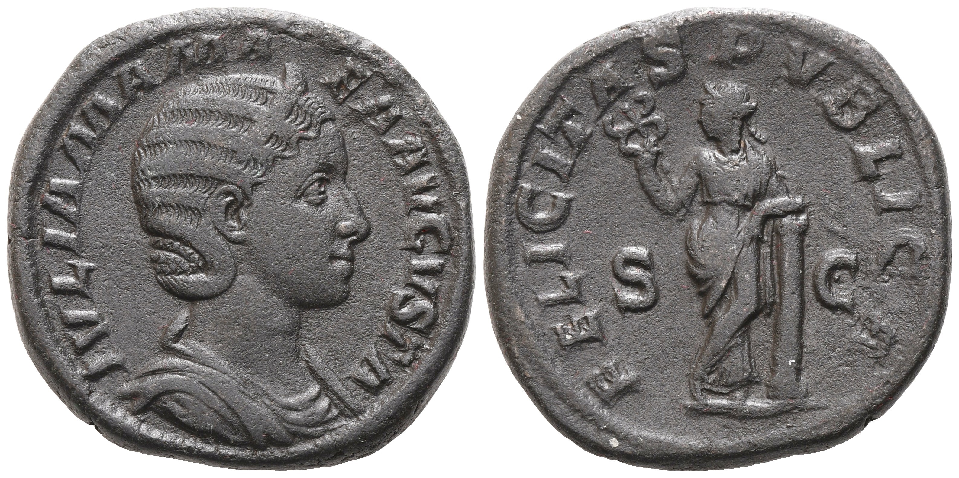 Draped and laureate bust of Julia Mamea to r.; Rv. Felicitas standing to l., carrying caduceus and leaning on column, between Uncirculated around legend. RIC 676. Dark patina. gVF