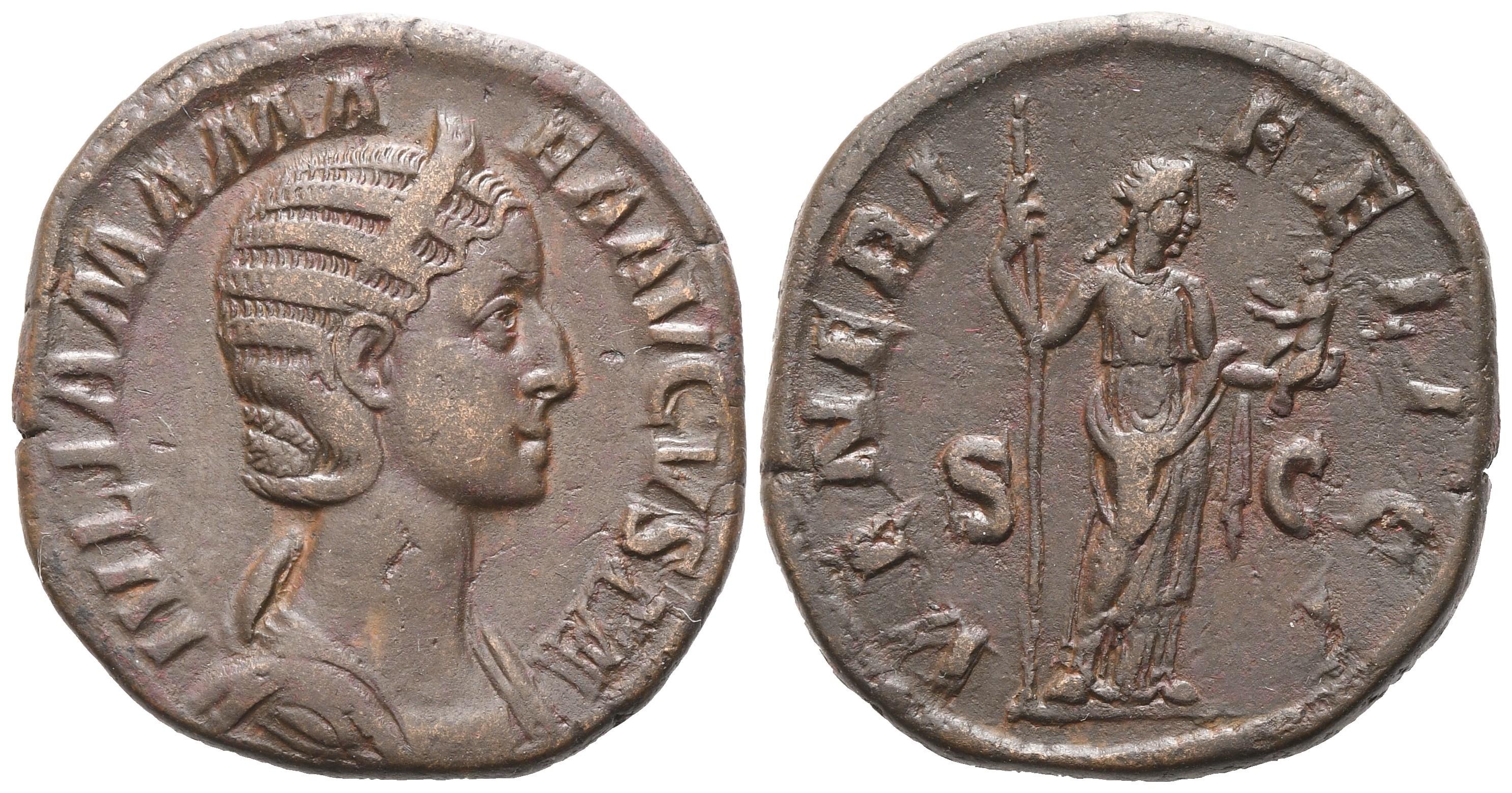 IVLIA MAMAEA AVGVSTA Diademed and draped bust of Julia Mamaea r.; Rv. VENERI FELICI / S - C Venus standing front, head to right, holding long sceptre in her right hand and cupid in her left- RIC IV-694 (Severus Alexander); BMCRE-190 (Severus Alexander). Reddish brown patina. About extremely fine.