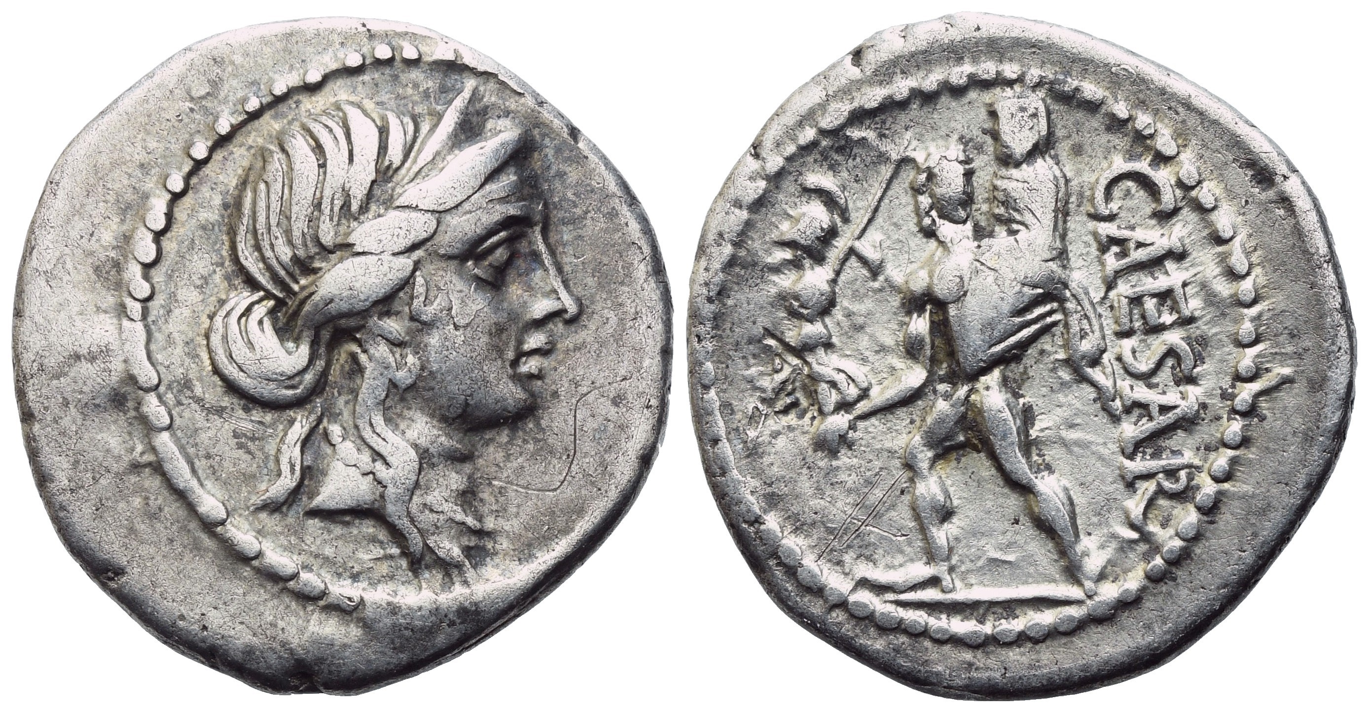 Head of Venus right, wearing stephane and necklace, with hair rolled and pulled into chignon at back of head, some loose curls behind; Rv. CAESAR, Aeneas advancing left, head facing, palladium left in outstretched right hand, carrying Anchises on his left shoulder. Crawford 458/1. Sydenham 1013. Julia 10. Good very fine.