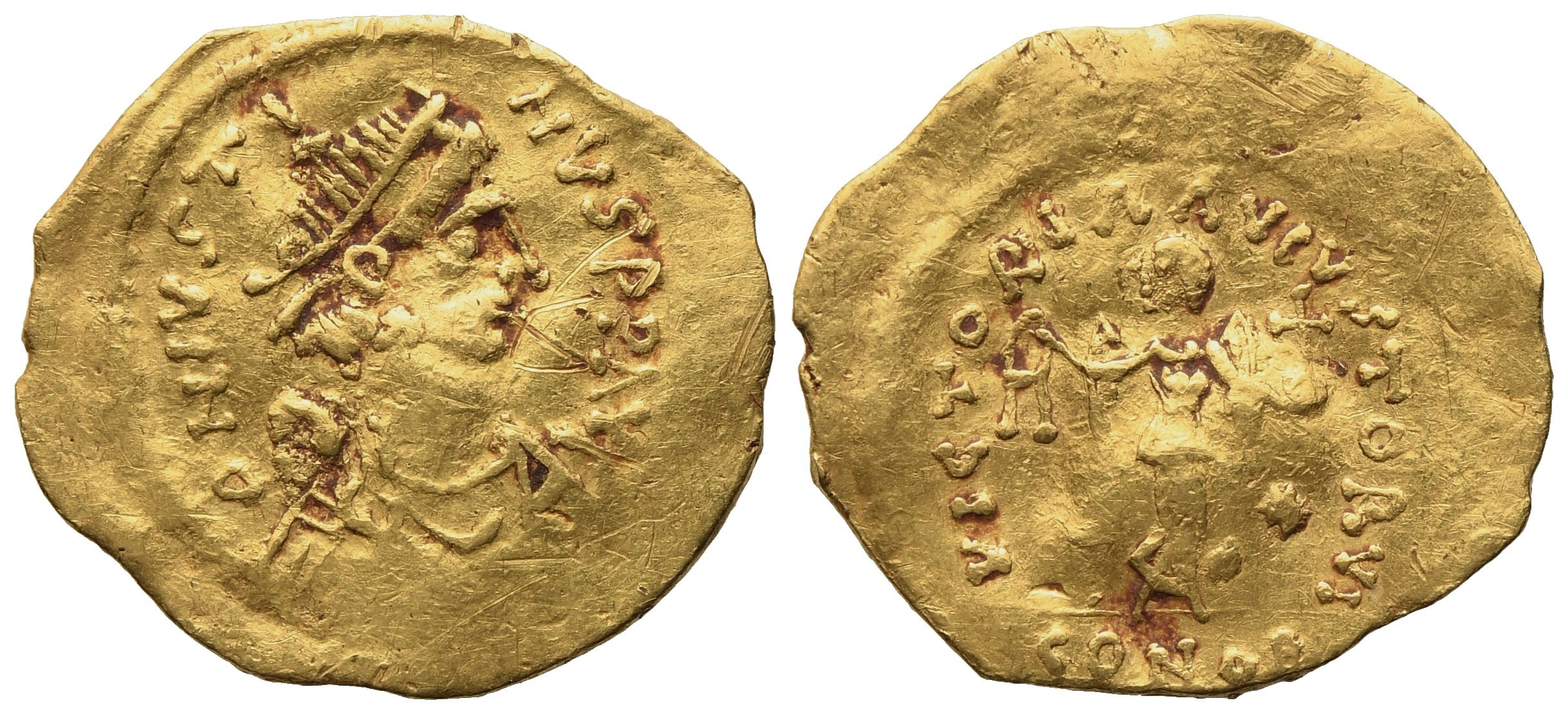 D N IVSTI β NVS PP AVG, diademed, draped, and cuirassed bust r.; Rv. VICTORIA AVGVSTORVM, Victory walking r., head l., holding wreath and globus cruciger; star in right field, CONOB in exergue. DOC I 4; MIB I 5; Sear 58. Some scratches on the obverse, otherwise very fine.
