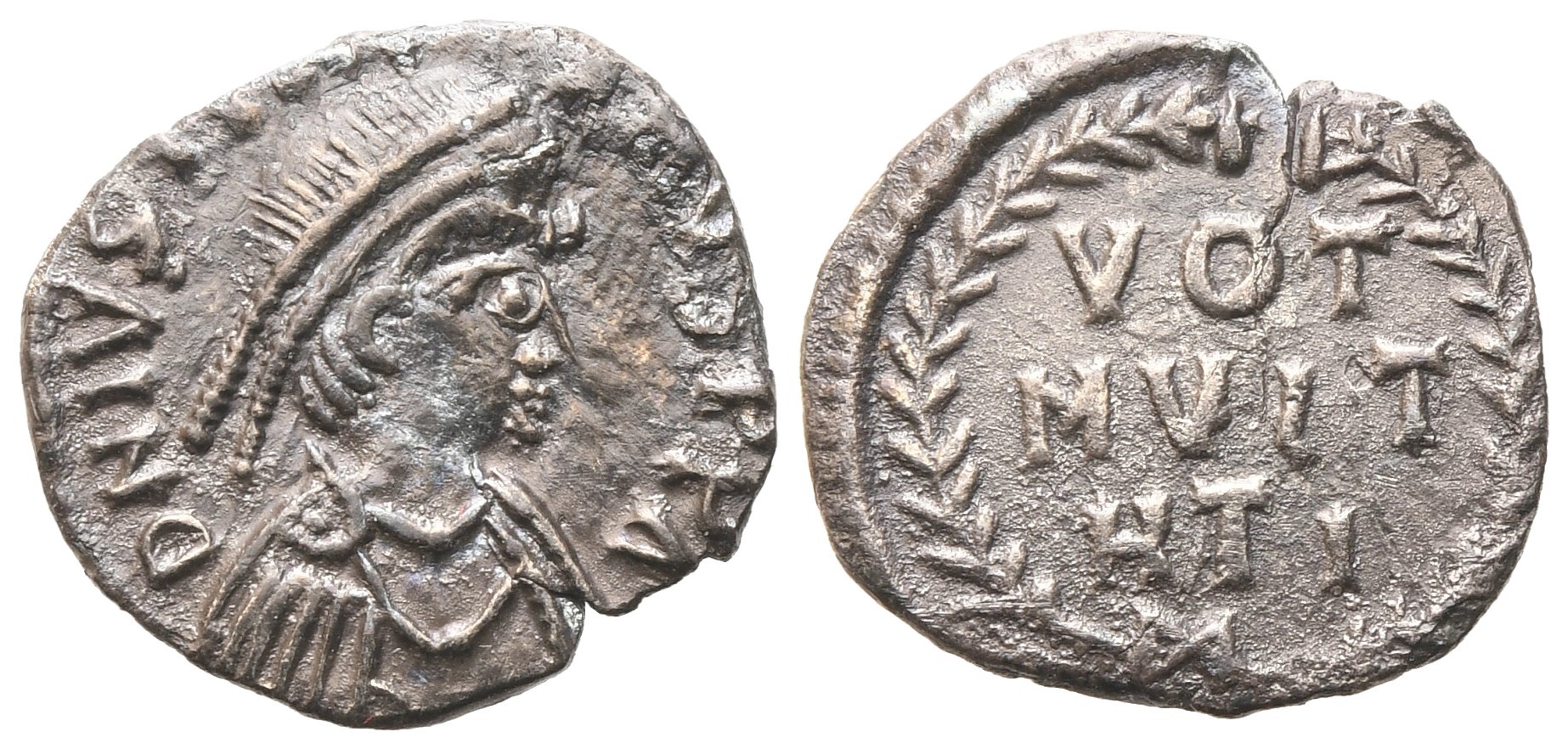 D N IVSTINI-ANVS PP AI Pearl-diademed and draped bust r.; Rv. VOT / MVL / HTI within wreath. Ex. CONOS. Sear 253. Rare. Irregular flan, otherwise about extremely fine. Issued at Carthage after the reconquest of the African province from the Vandals by Belisarius.