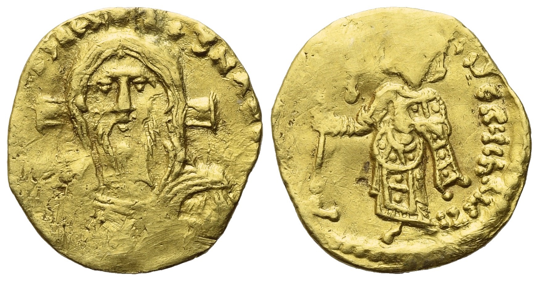 IhS CRISΤUS RЄX RЄςNANΤIЧM, facing half-length bust of Christ Pantocrator, cross behind, right hand in gesture of benediction, book of Gospels in left arm Rv./ D IЧSTINI-AN-ЧS SERЧ CHRISΤI, Justinian standing facing, dressed in loros, holding cross potent on base. DOC 14. MIB 16. SB 1256. Very Fine. Rare.