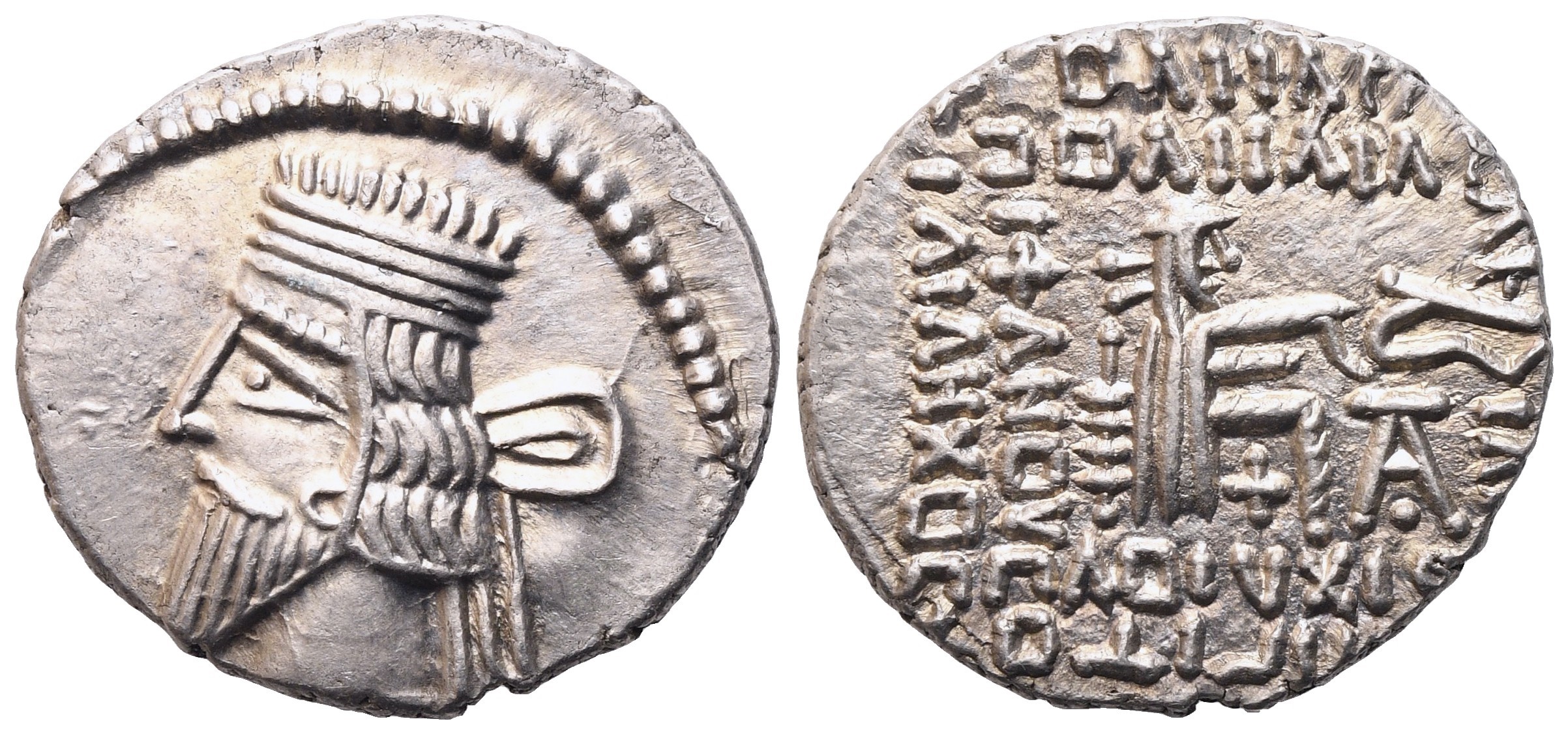 Diademed head to l., with long beard; Rv. Archer (Arsakes I) seated to right, no throne base visible, holding bow; monogram below bow. Sellwood 78.3 (Vologases III), Shore 413 (Vologases III). Extremely fine.