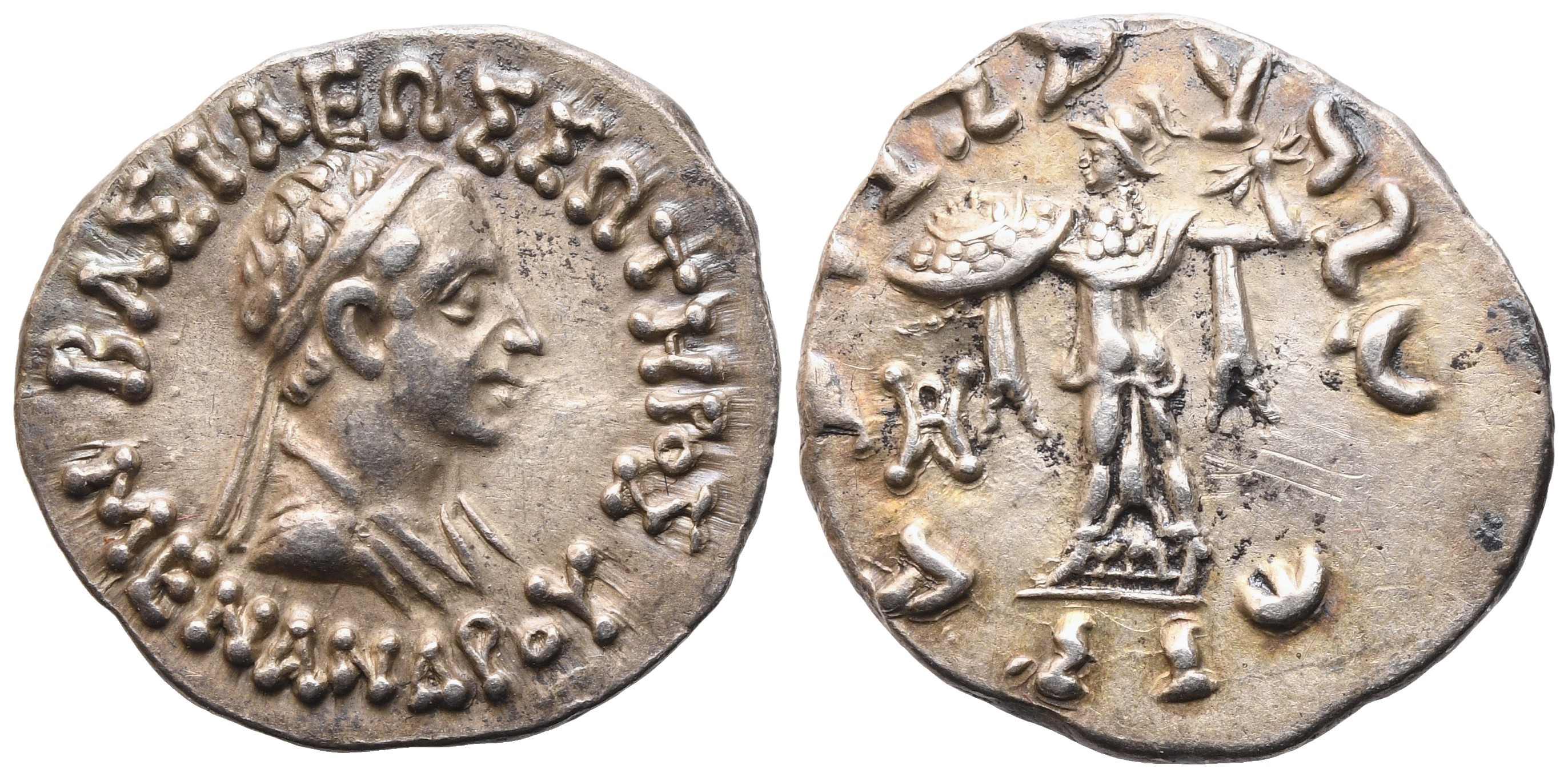 Kings of Bactria, Menander I Soter, Drachm, 165/155-130 BC; AR (2,42 g; 17 mm; 11 h)