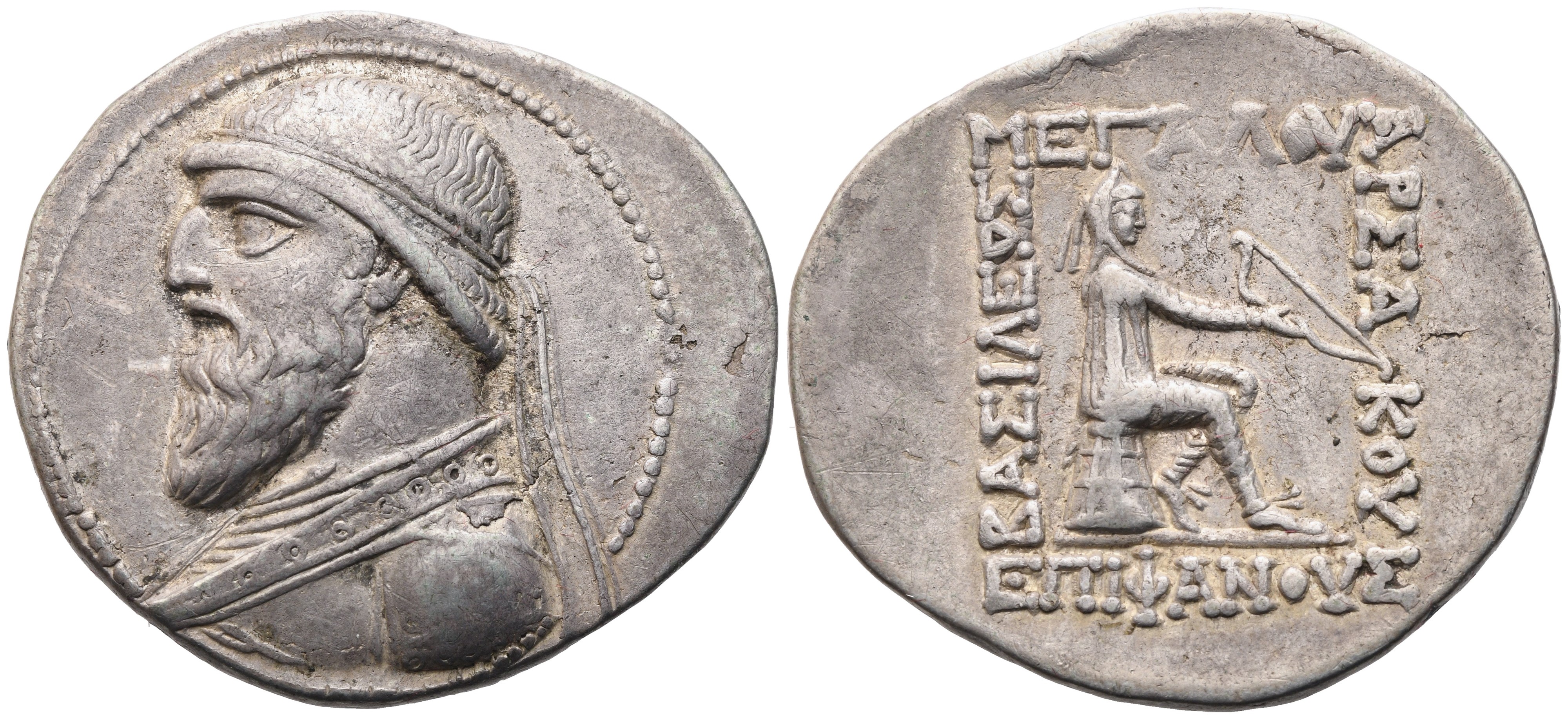 Diademed and draped bust of Mithradates l. Dotted border; Rv. ΒΑΣΙΛΕΩΣ / ΜΕΓΑΛΟΥ / ΑΡΣΑΚΟΥ / ΕΠΙΦΑΝΟΥΣ / TV Parthian archer seated r. on omphalos, holding bow; in outer r. field, palm and in exergue, Sellwood 24.4 var. Sunrise 284. Good very fine.