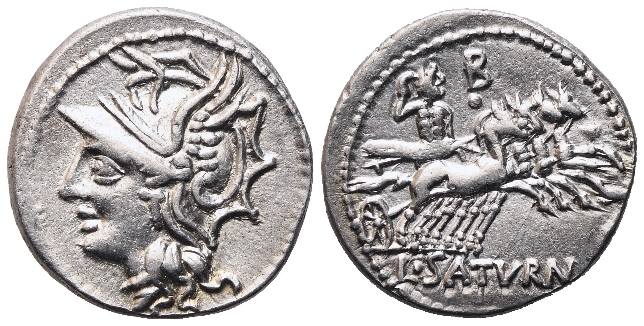 Helmeted head of Roma l.; Rv. Saturn in quadriga r., holding reins and harpa; above, B· (control letter); in exergue, L·SATVRN. Crawford 317/3a; Babelon (Appuleia) 1; Sydenham 578. Good extremely fine. Attractive lustre.