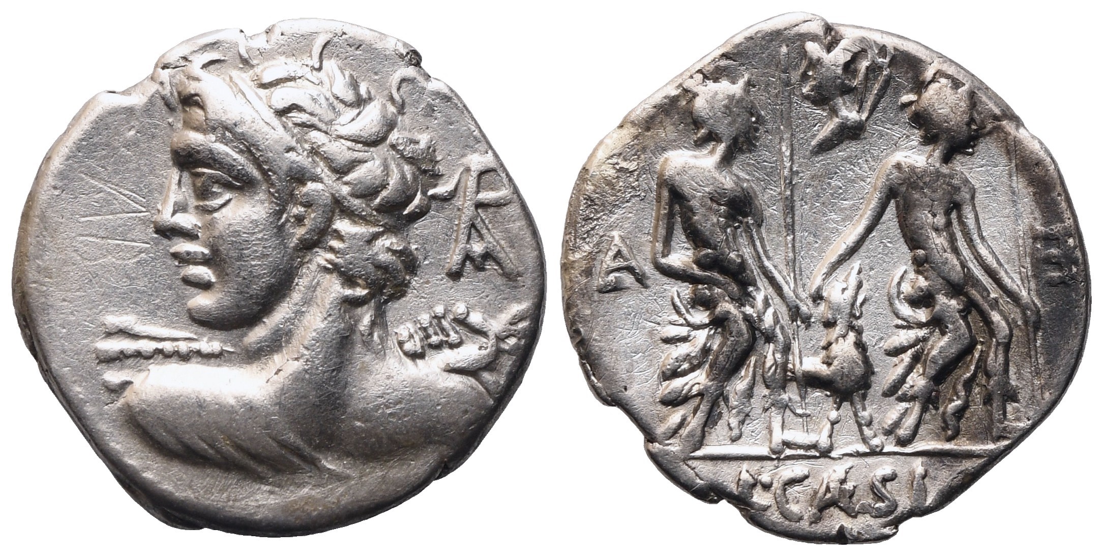 Bust of Veiovis l., hurling thunderbolt; monogram behind; Rv. Lares Praestites seated r. with dog between them; head of Vulcan and tongs above; monograms to outer l. and r., L·CAESI in exergue. Crawford 298/1; Babelon (Caesia) 1; Sydenham 564. Graffiti on the obverse. Extremely fine.