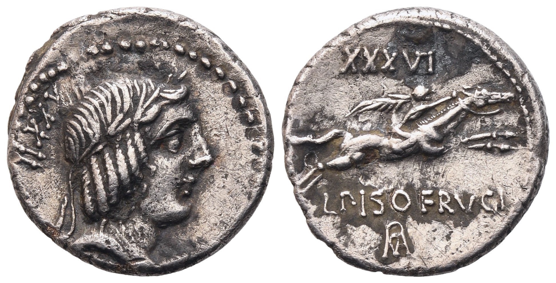 Head of Apollo r,; behind XXXII; Hoseman r. holding palm; above XXXVI; below, L PISO FRVGI / ROMA in monogram. Crawford 340/1; Sydenham 661; Calpurnia 12; RBW 1256 var. (control numbers). Good very fine.