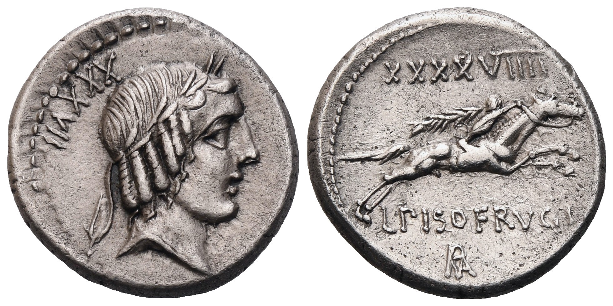 Laureate head of Apollo right; XXXVIII behind / Naked horseman galloping right, holding palm frond; XXXXVIIII above, L β’ PISO FRVGI and ROMA monogram below. Crawford 340/1; Babelon (Calpurnia) 12; Sydenham 661. About extremely fine.