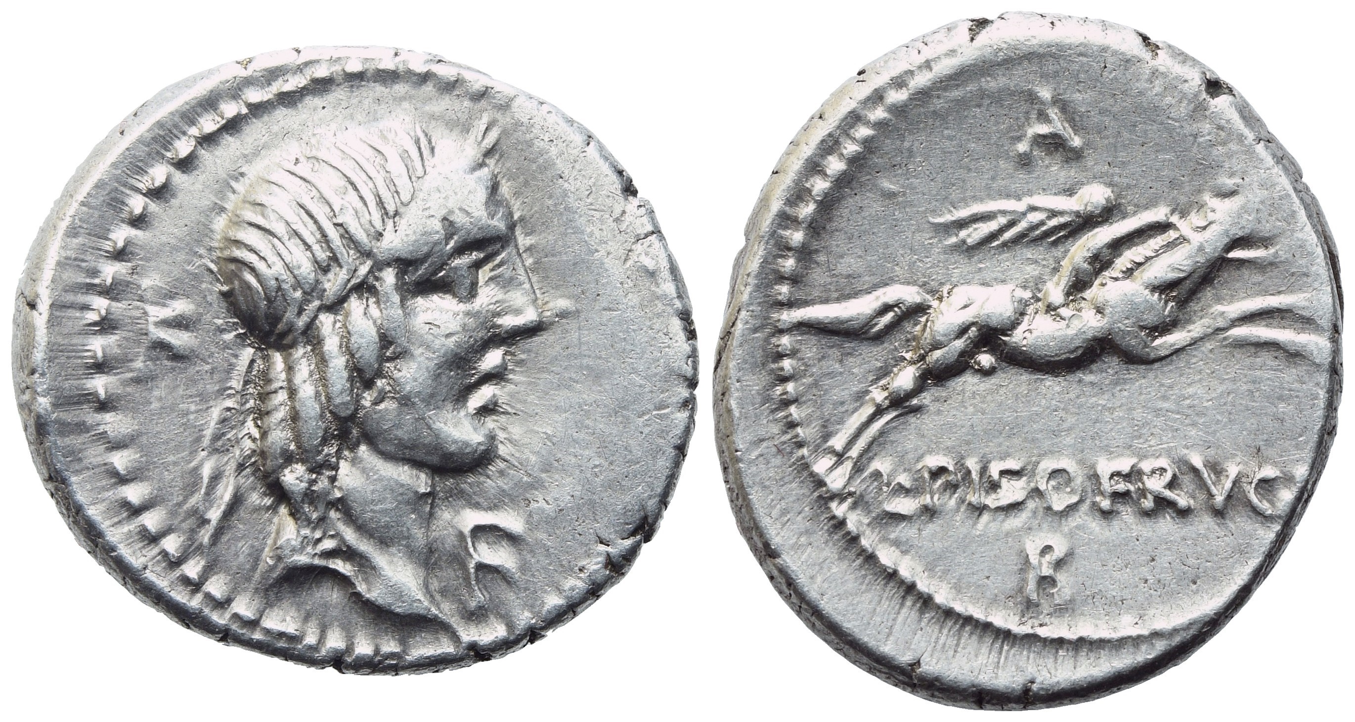 Laureate head of Apollo r.; K behind, before F; Rv. Horseman riding to right carrying palm; A above, L•PISO•FRVGI and monogram below. Crawford 340/1; RSC Calpurnia 7. Good very fine. Nice lustre.