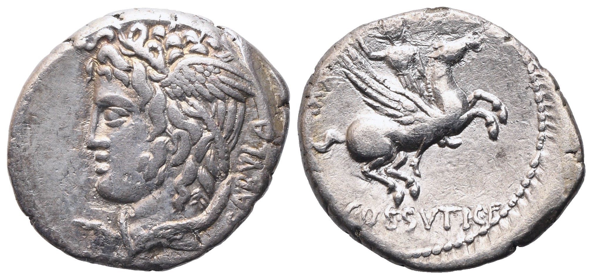 Head of Medusa l., wearing winged diadem and entwined with serpents; behind, SABVLA; Rv. Bellerophon riding Pegasus r., brandishing spear with right hand; control numeral behind; below, [L·]COSSVTI·C·F. Crawford 395/1; Babelon (Cossutia) 1; Sydenham 790. VF
