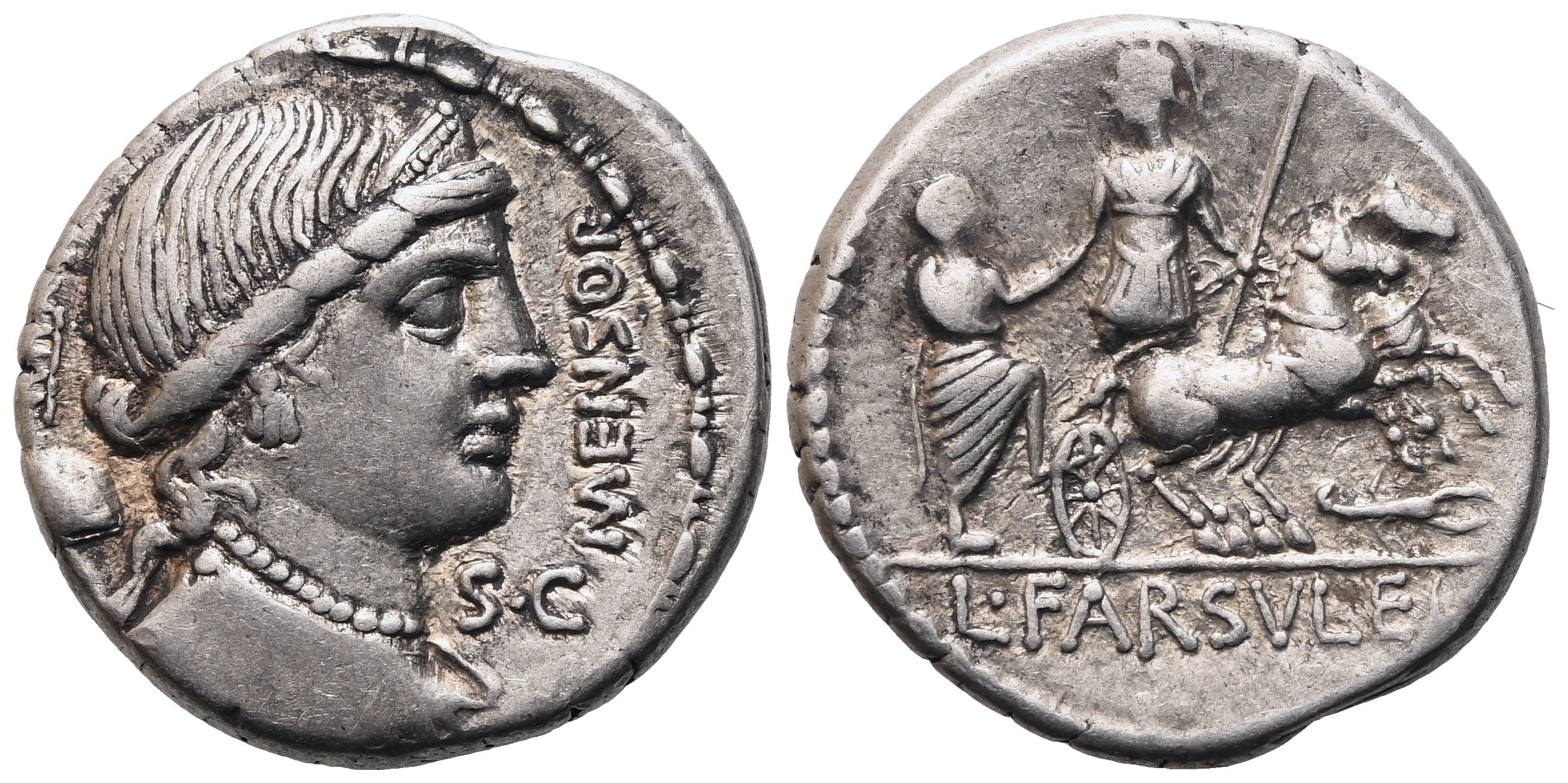 Bust of Libertas r., draped and wearing diadem; behind, pileus; before, MENSOR upwards; below chin, S·C; behind, I (control mark); bead-and-reel border; Rv. Warrior holding spear and reining in biga r. with l. hand; with r. hand he assists togate figure into biga; below, scorpion; in exergue, L·FARSVLEI. Crawford 392/1a. Babelon (Farsuleia) 1; Sydenham 789. Good very fine.