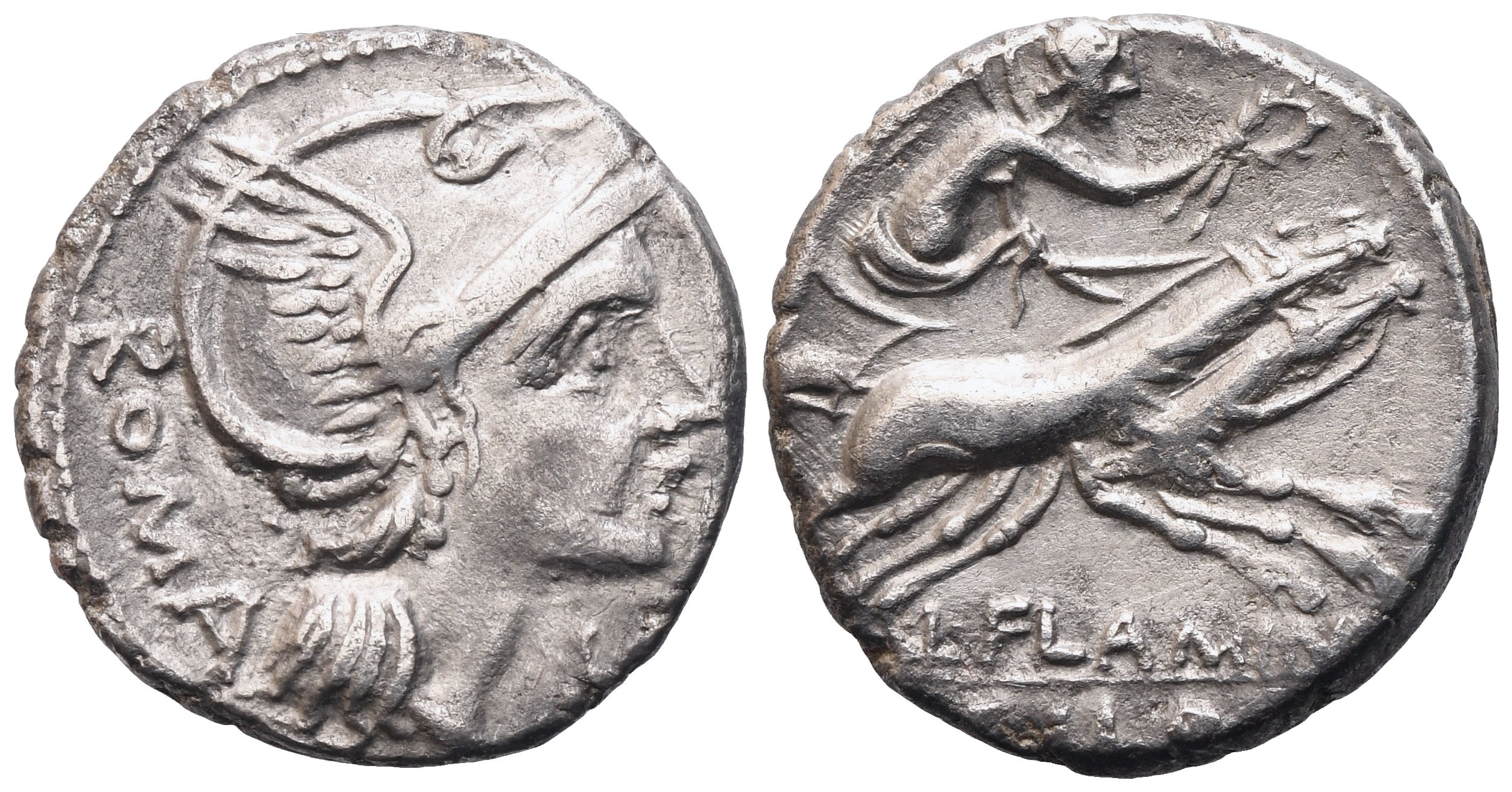 Head of Roma to r., wearing winged helmet; behind, ROMA; before, X (mark of value); Rv. Victory driving biga to r., holding wreath in her r. hand and reins in her l.; below, L·FLAMIN[I]; in exergue, [C]ILO. Crawford 302/1; Babelon (Flaminia) 1; Sydenham 540. VF / gVF