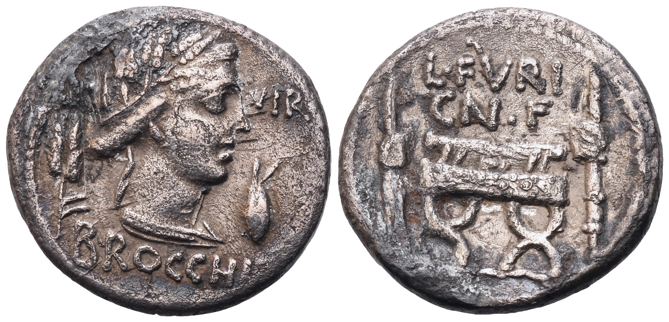 Wreathed head of Ceres r., between corn ear and barley grain; on either side, III VIR; below, BROCCHI; Rv. Curule chair between fasces; above, L·FVRI / CN·F. Crawford 414/1; Babelon (Furia) 23; Sydenham 902. VF