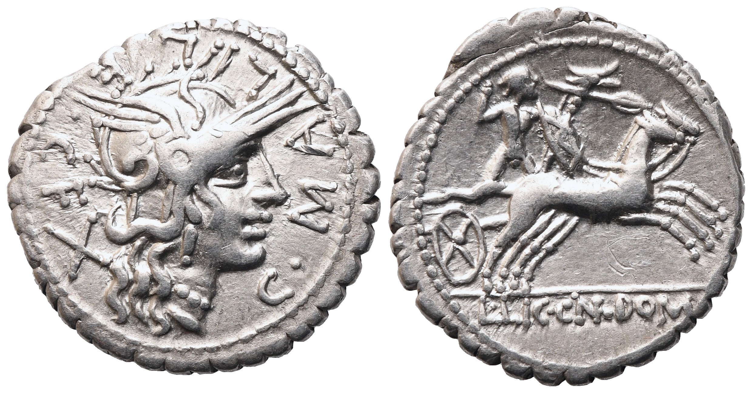 Helmeted head of Roma r.; around, C·M·A - L - L·E - C·F; behind, X (mark of value); Rv. Bearded warrior in fast biga r., holding shield, carnyx and reins and hurling spear; in exergue, [L·LIC·]CN·DOM. Crawford 282/3; Babelon (Poblicia) 1, (Licinia) 13, (Domitia) 17; Sydenham 524. Extremely fine. Lustrous.
