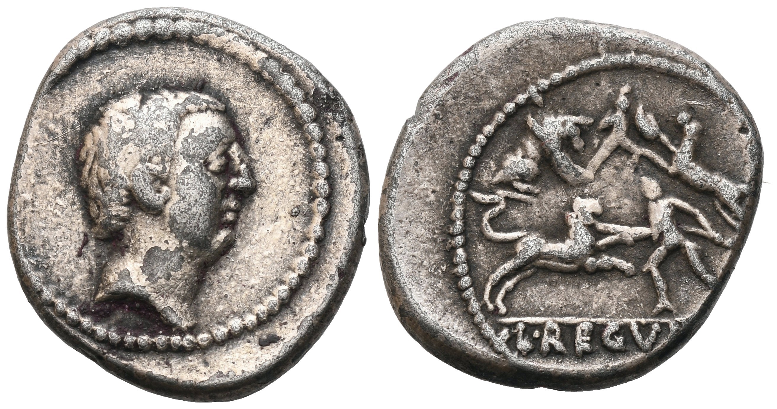 Head of L. Regulus r.; Rv. Wild beast fight; in foreground one man attacks lion with spear; in background second man with shield and sword attacks panther; on l., wounded boar; in exergue, L·REGVLVS. Crawford 494/30; Babelon (Livineia) 12; Sydenham 1112. Very fine.