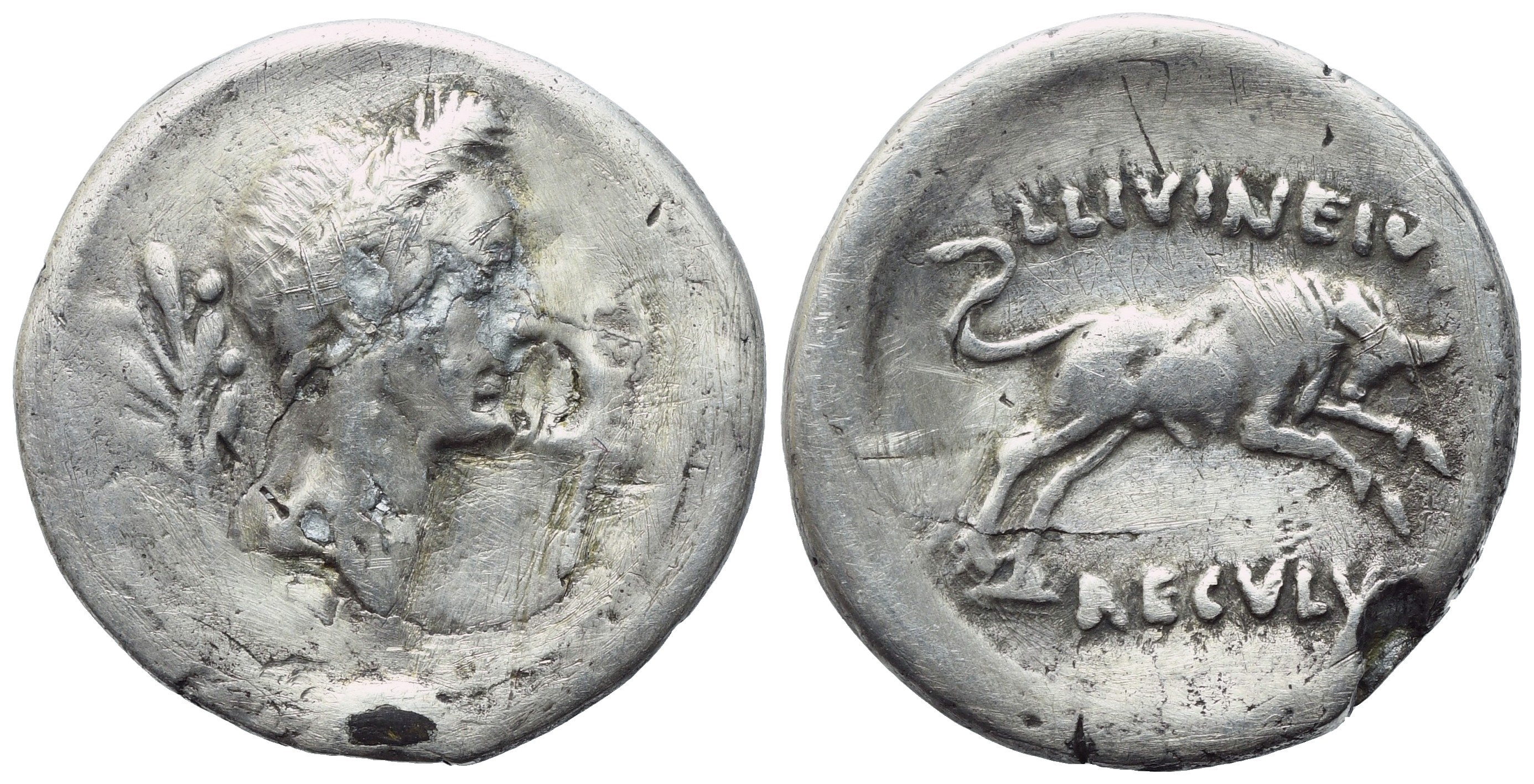 Livineius Regulus, moneyer. Laureate head of Caesar r.; behind, laurel branch and before, caduceus; Rv. L·LIVINEIVS / REGVLVS Bull charging r. Babelon Julia 57 and Livineia 1. Sydenham 1106. Sear Imperators 115. RBW 1730. Crawford 494/24. VF