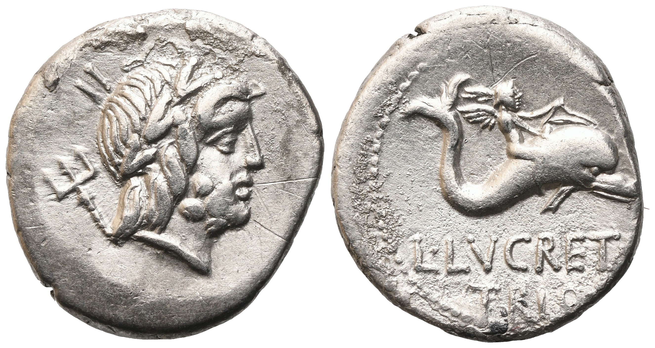 Laureate head of Neptune r., trident over shoulder and II (control number) behind; Rv. Infant Genius riding dolphin r.; L·LVCRET[I] / TRIO below. Crawford 390/2; Babelon (Lucretia) 3; Sydenham 784. A few scratches, otherwise gVF / aEF