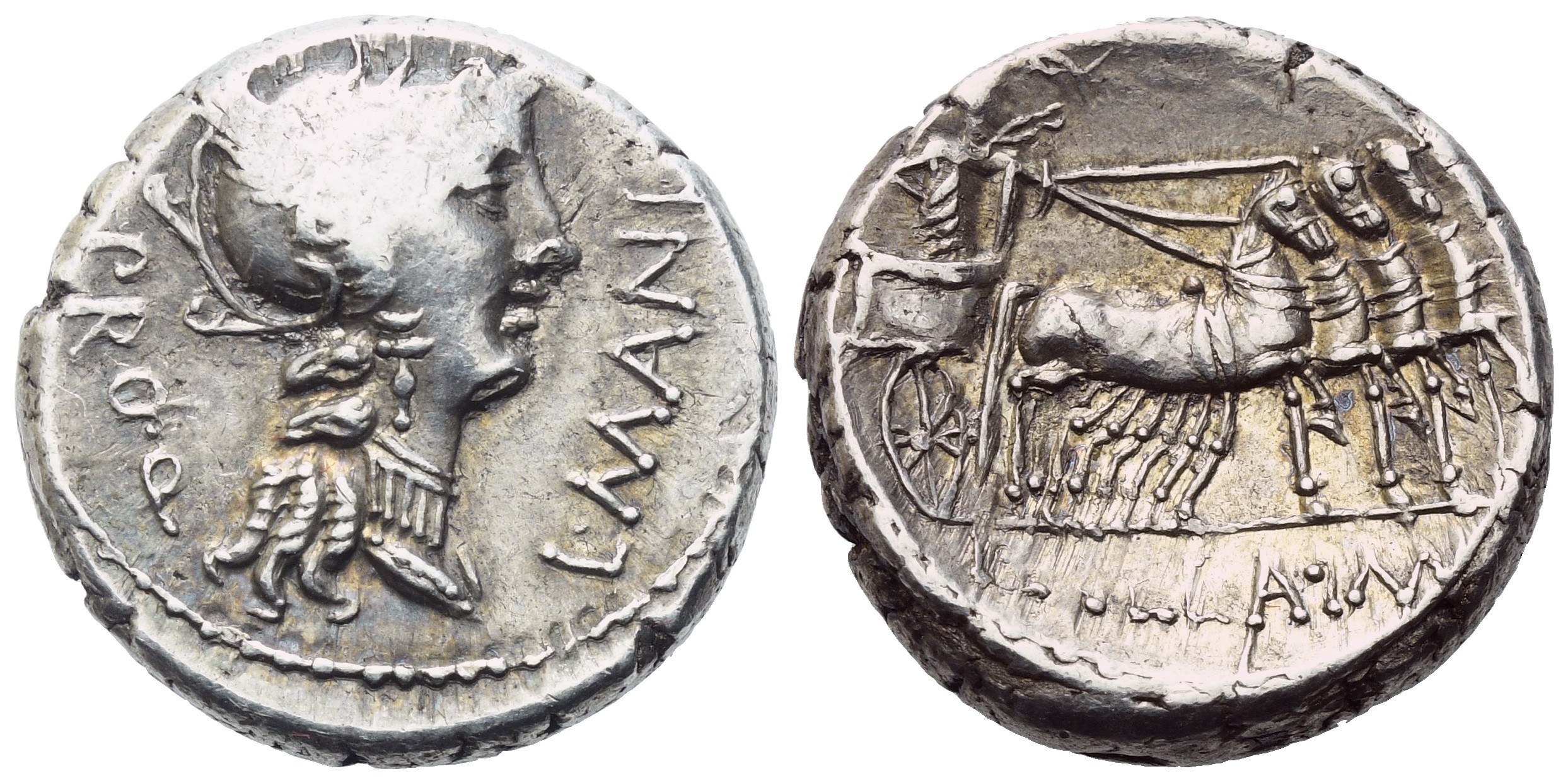 L•MANLI T - PRO•Q Head of Roma to right, wearing winged helmet, pendant earring and pearl necklace. Rev. L•SVLLA•IMP Sulla driving triumphal quadriga to right, holding caduceus in his right hand and reins with his left; above, Victory flying left, crowning him with laurel wreath. Babelon (Manlia) 7 and (Cornelia) 42. Crawford 367/3. RBW 1384. Sydenham 759. aEF / EF. Nice old cabinet tone.