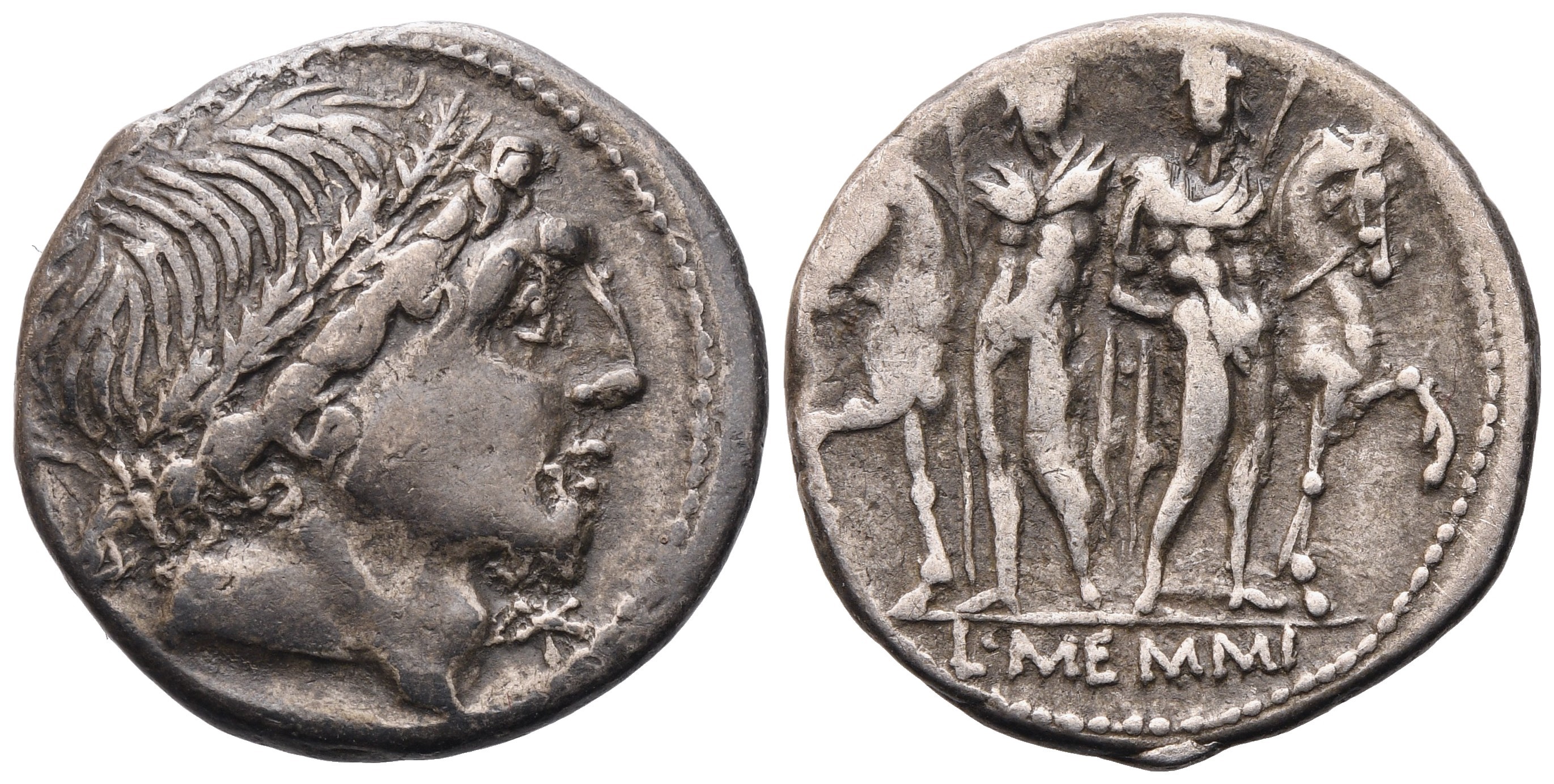 Young male head r. wearing oak-wreath before, * (mark of value); Rv. Dioscuri standing facing between their horses, each holding spear; in exergue, L·MEMMI. Crawford 304/1; Babelon (Memmia) 1; Sydenham 558. VF