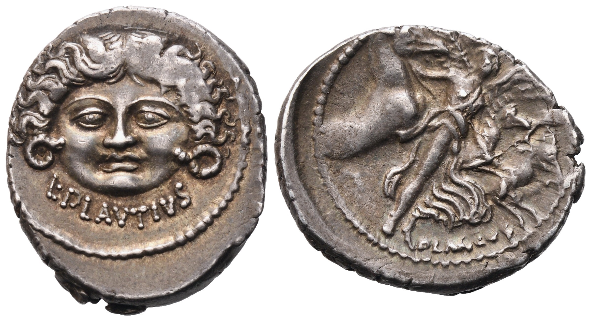 Head of Medusa from the front, hair ending in snakes; Rv. Winged Aurora flying to the right and leading the four horses of the sun. CRR 559a; Crawford.453 /1a; RSC 14; RCV 429. Good very fine / very fine.