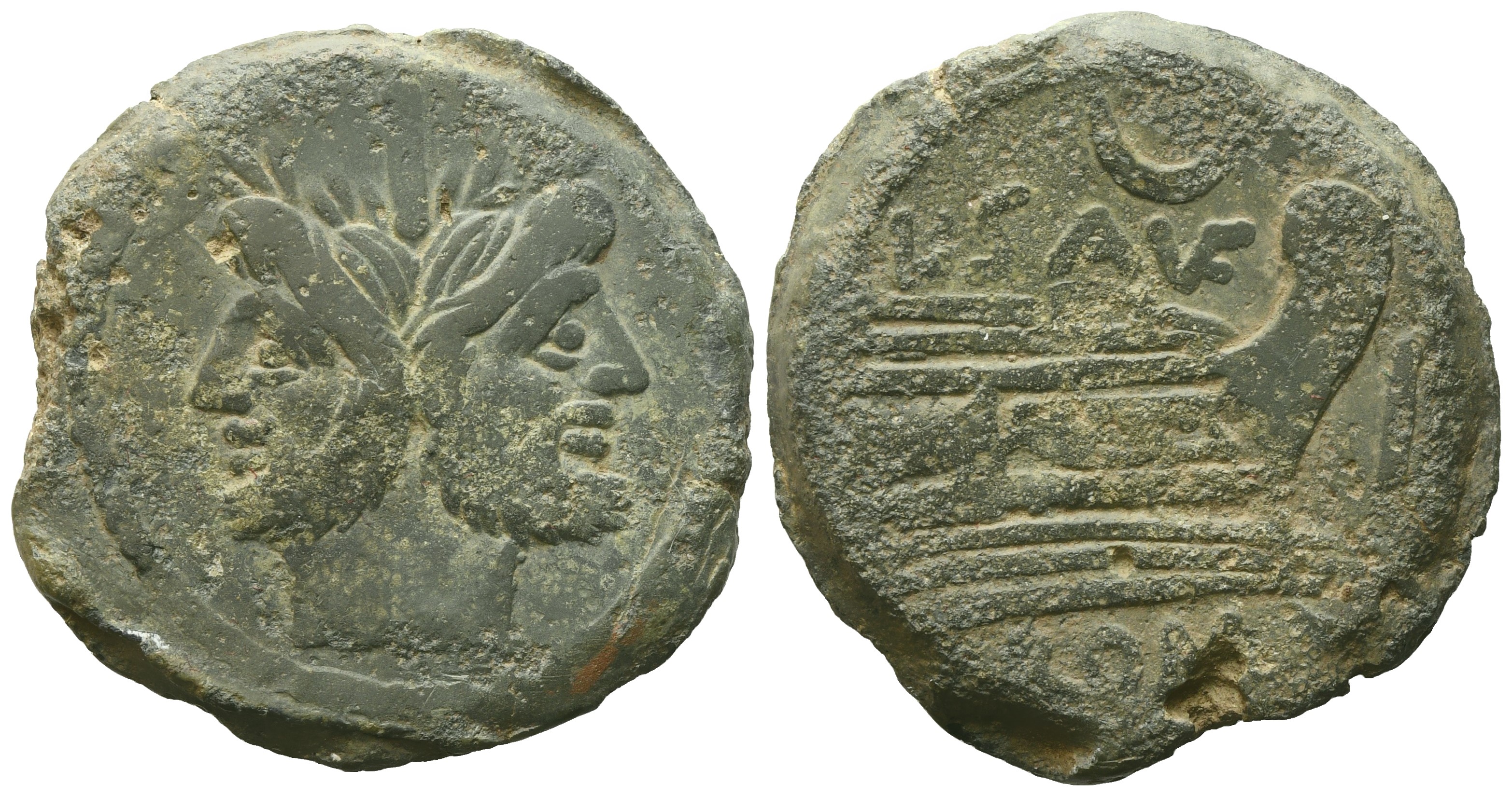 Laureate head of Janus; above, I (mark of value); Rv. Prow r.; above, L SAVF and crescent; before, I (mark of value); below, ROMA. Crawford 204/2; Babelon (Saufeia) 2; Sydenham 385. Brownish green patina. Very fine.