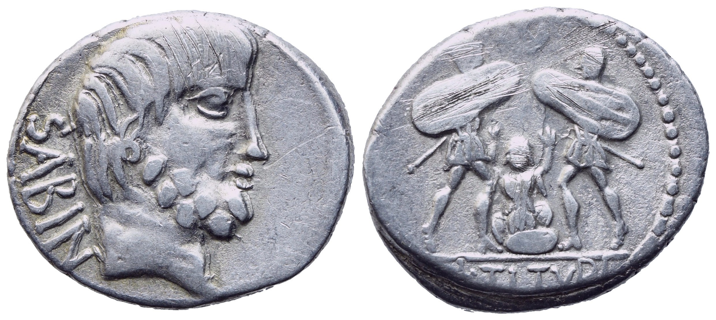 SABIN Bare-headed and bearded head of King Titus Tatius to r.; [in lower field to right, palm frond]; Rv. L•TITVRI Tarpeia, facing and buried to her waist in shields, thrusting off two soldiers with her r. hands who are about to cast their shields at her; above, star in crescent. Babelon (Tituria) 4. Crawford 344/2b. RBW 1301. Sydenham 699. Almost gVF
