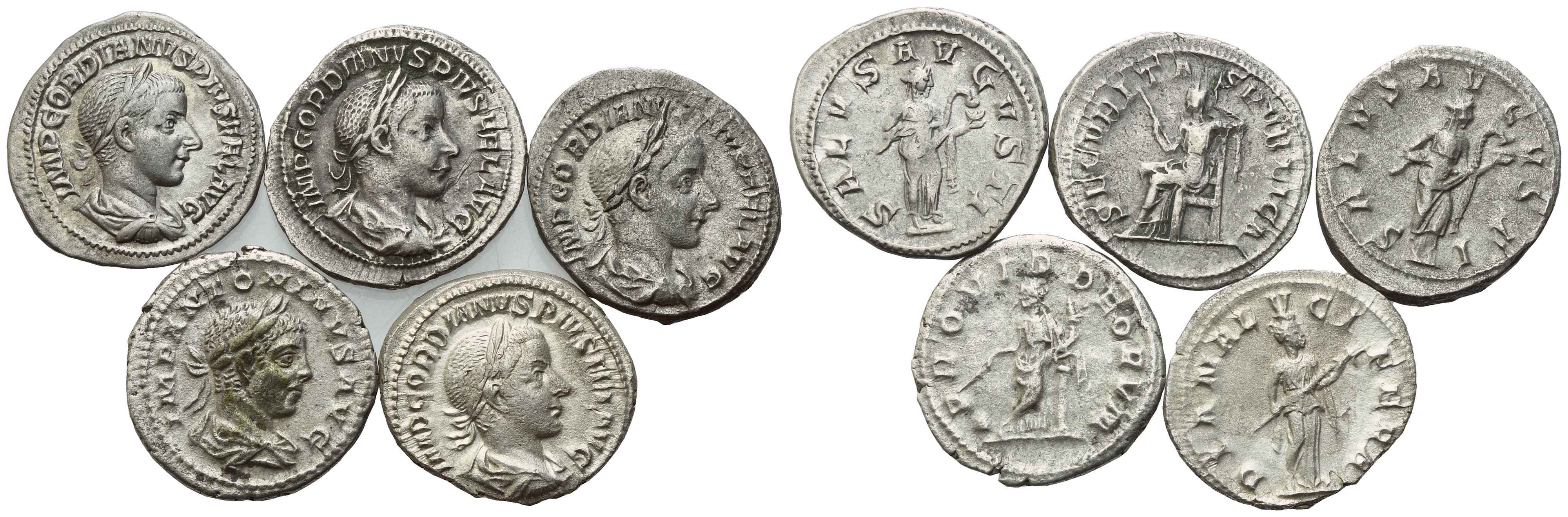 Lot of 5 Roman AR coins to be catalogued. Lot sold as is, no returns.