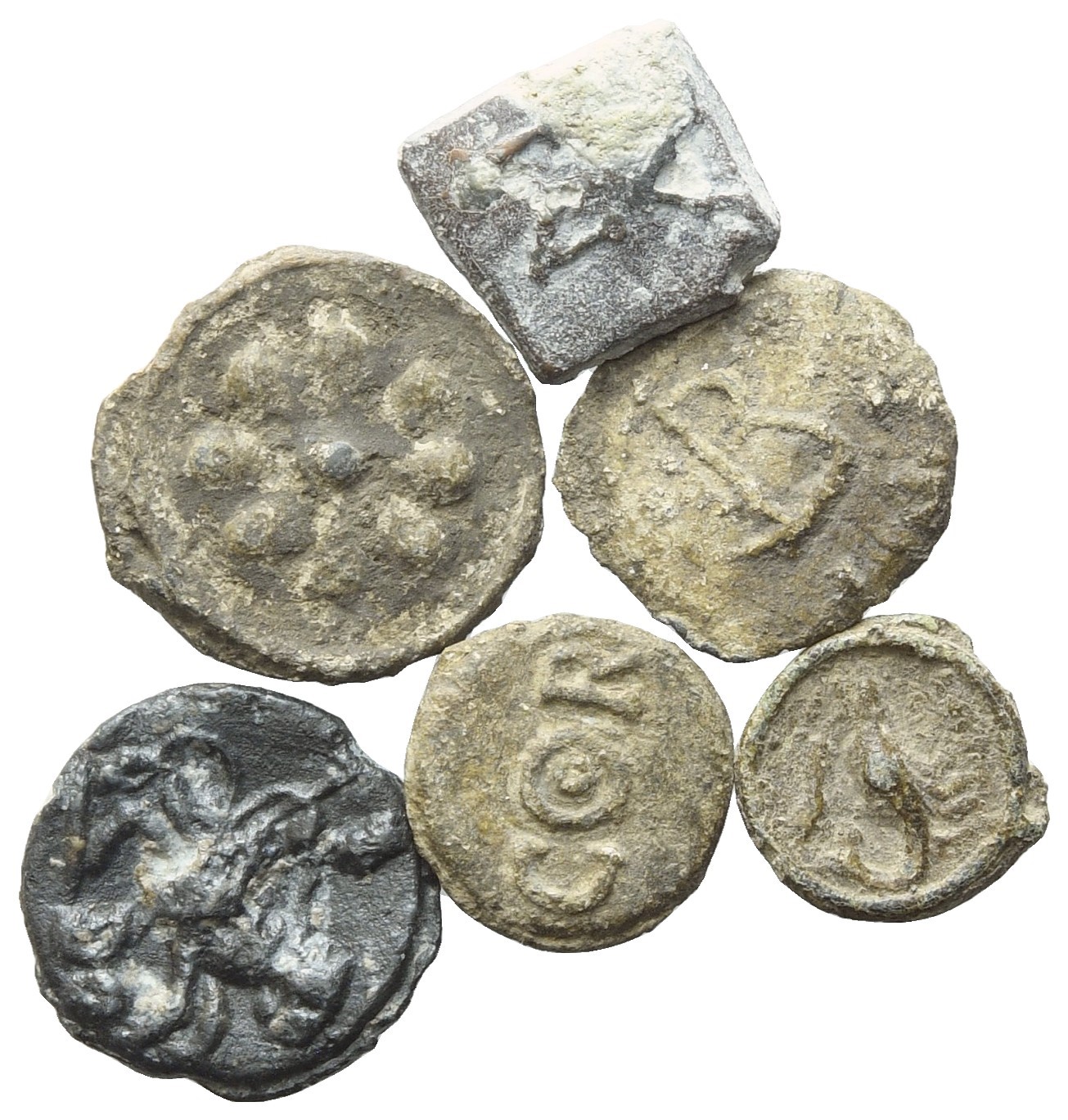 Lot of 6 lead tesserae. Lot to be sold as is, no returns.