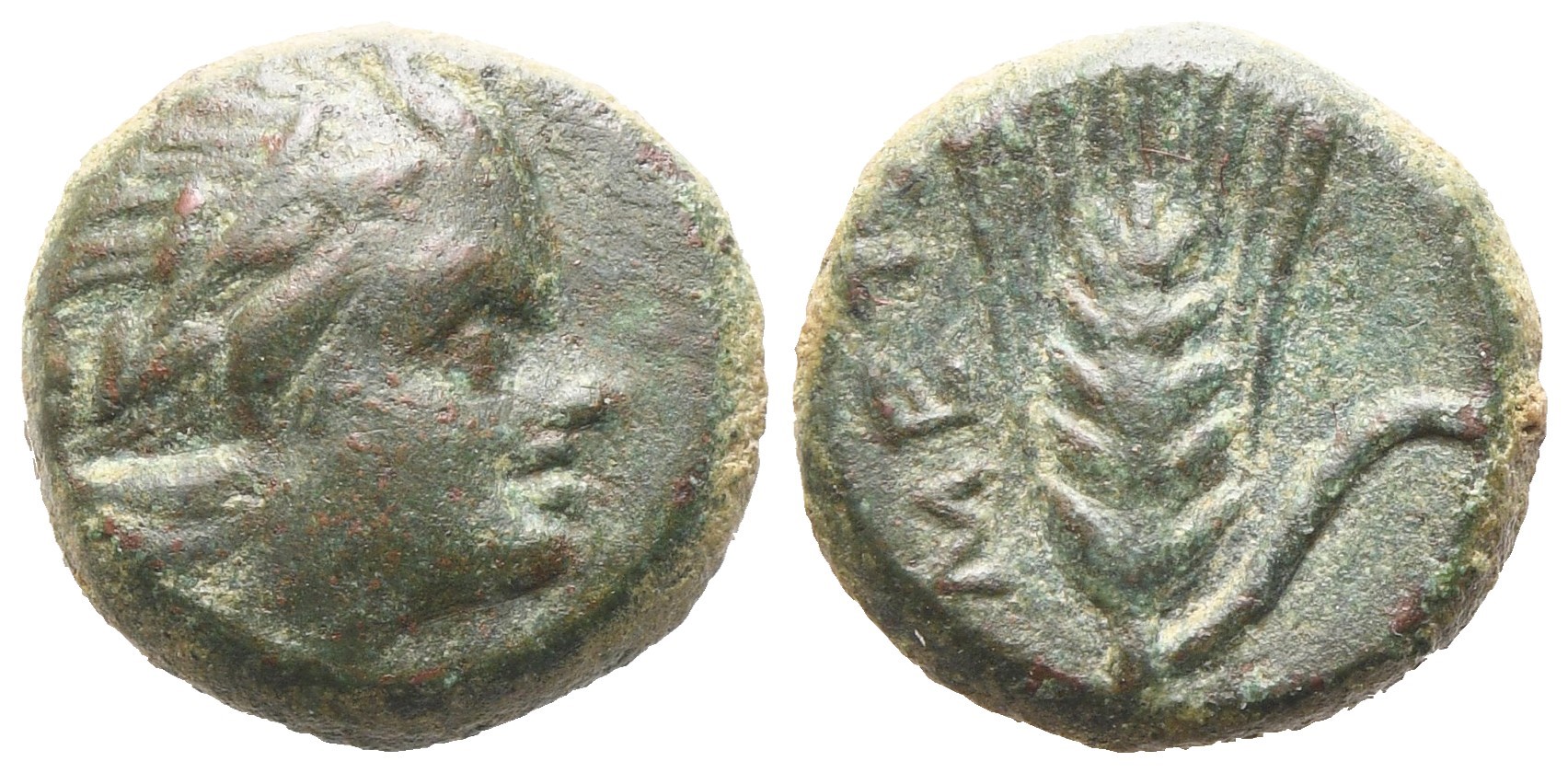 Head of Pan r., wearing ivy-wreath; Rv. META Barley-ear with leaf to r. HN Italy 1658 var. (head r.). Green patina with some red spots. VF