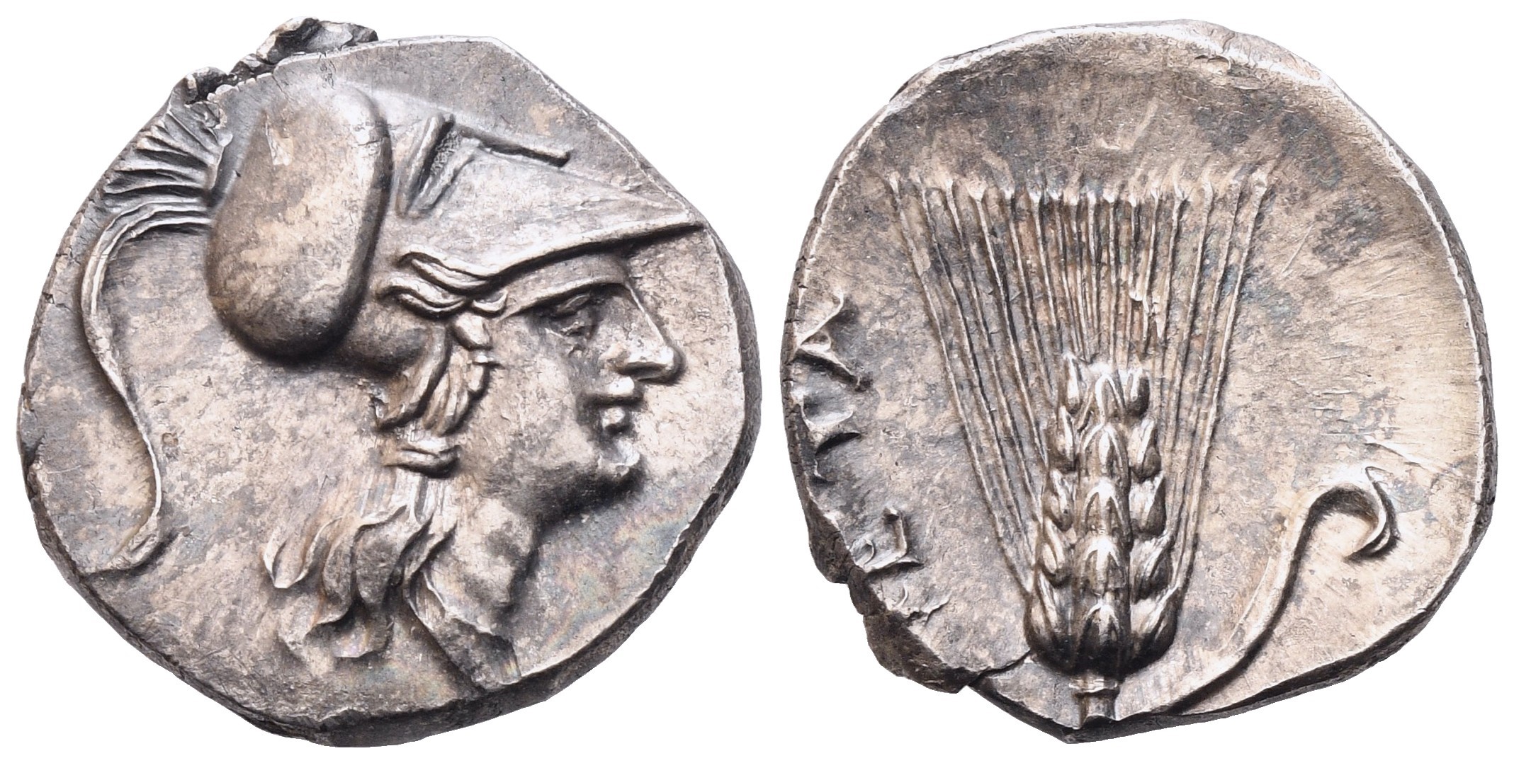 Head of Athena to right, wearing Corinthian helmet. Rev. ΜΕΤΑ Grain ear with leaf to right. HN Italy 1632. Robinson NC 1964, The Coinages of the Second Punic War, p. 50, 1 and pl. VI, 4. SNG ANS 549. SNG Lockett 437. Good very fine.