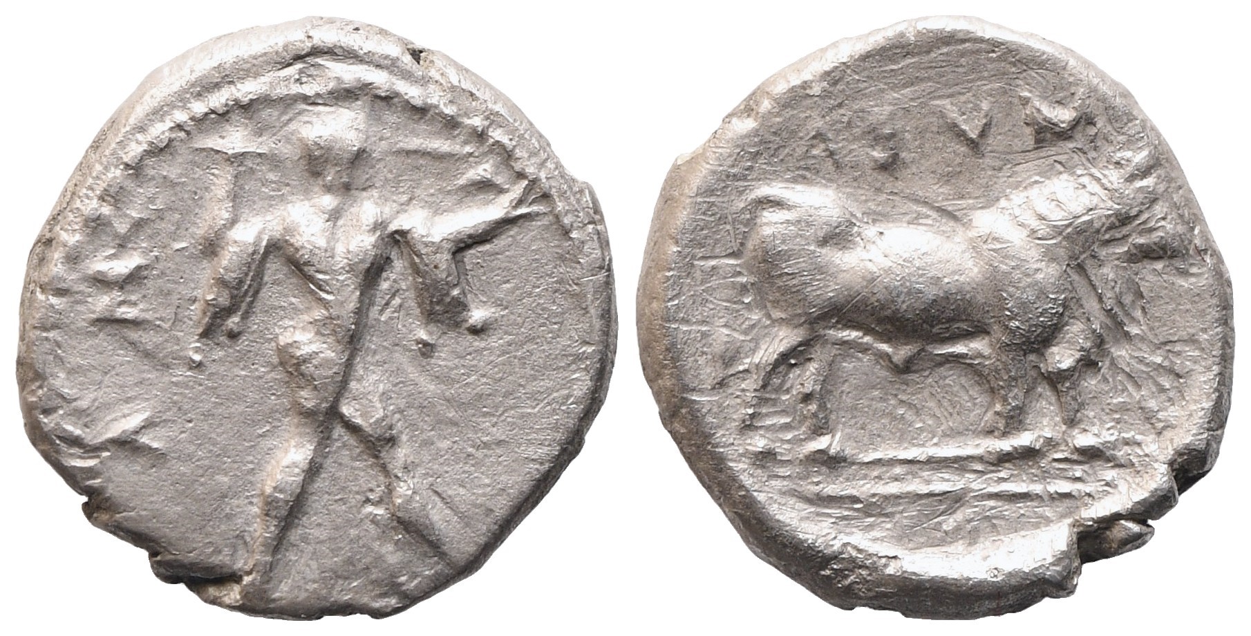 Poseidon walking r., wielding trident; Rv. Bull standing r. HNItaly 1119; SNG ANS 701. VF