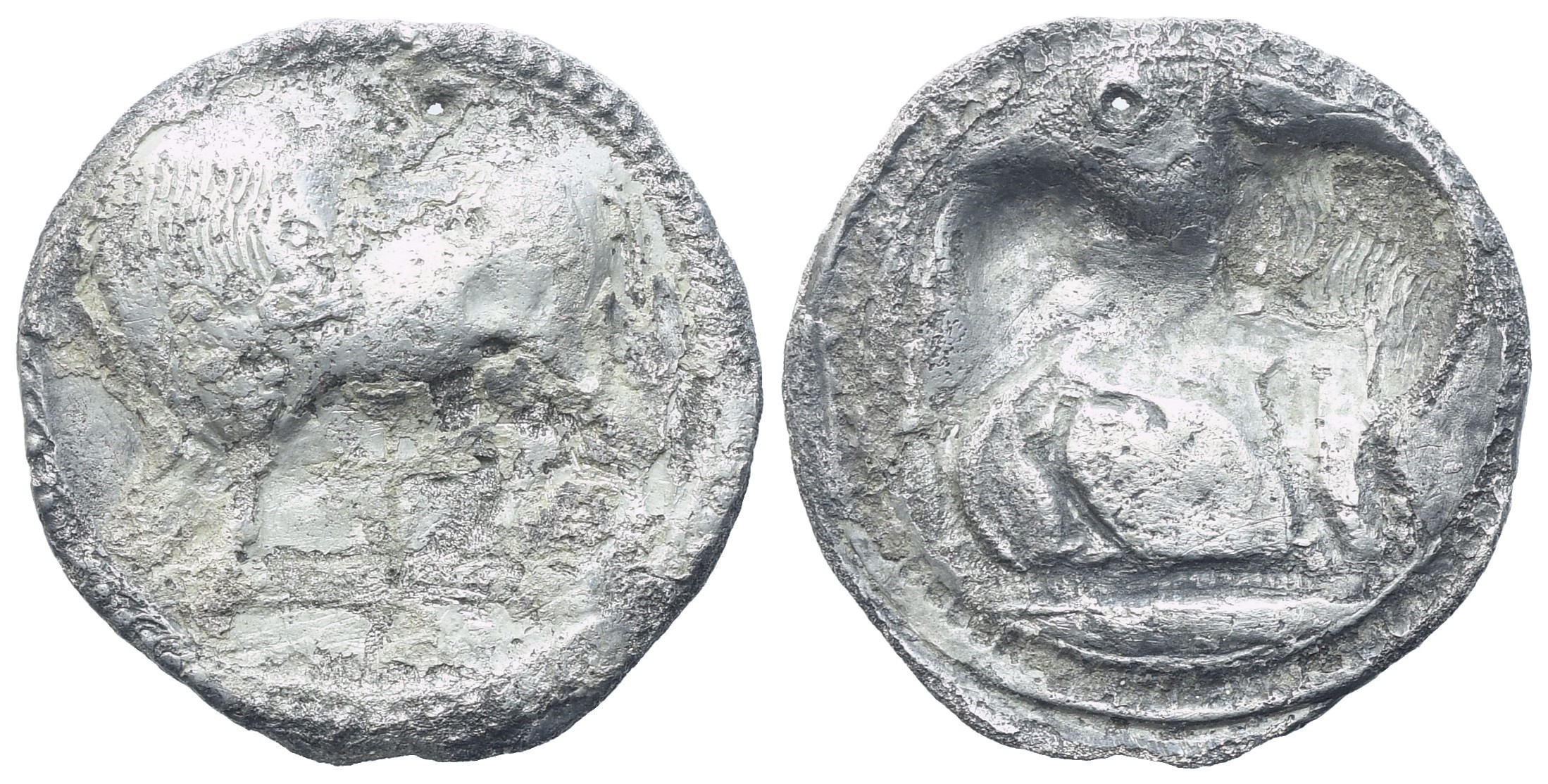 Bull standing to l., head to r.; [VM in exergue]; Rv. Incuse bull standing to r., head to l. SNG ANS 828-44; HN Italy 1729; HGC 1, 1231. Neat small hole at top. aVF