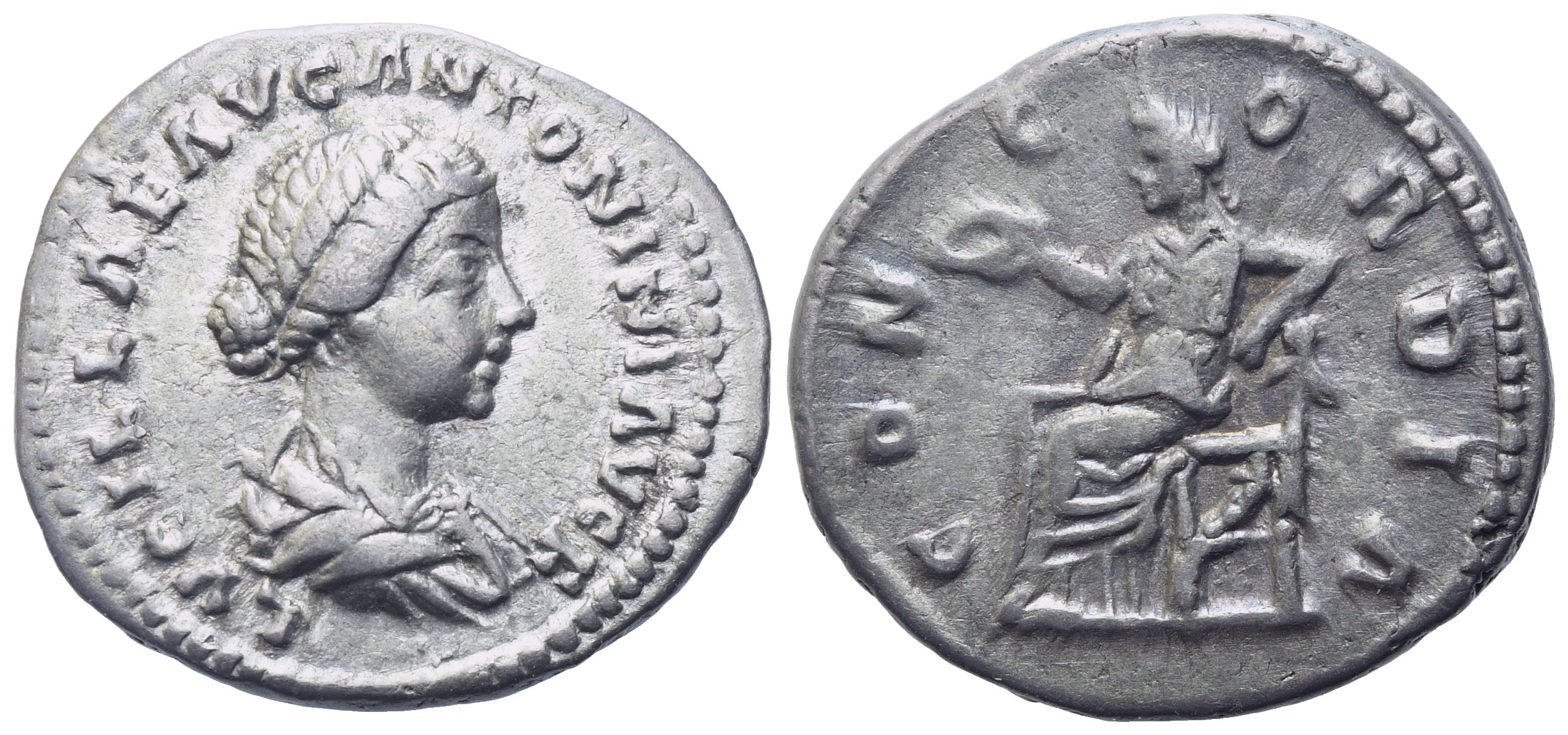 LVCILLAE AVG ANTONINI AVG F Draped bust of Lucilla to r.; Rv. CONCORDIA Concordia seated l. on throne, holding patera in her r. hand, and with her l. elbow resting on the back of the throne. Cohen 6. BMC 306. RIC 758 (M. Aurelius). Good very fine.