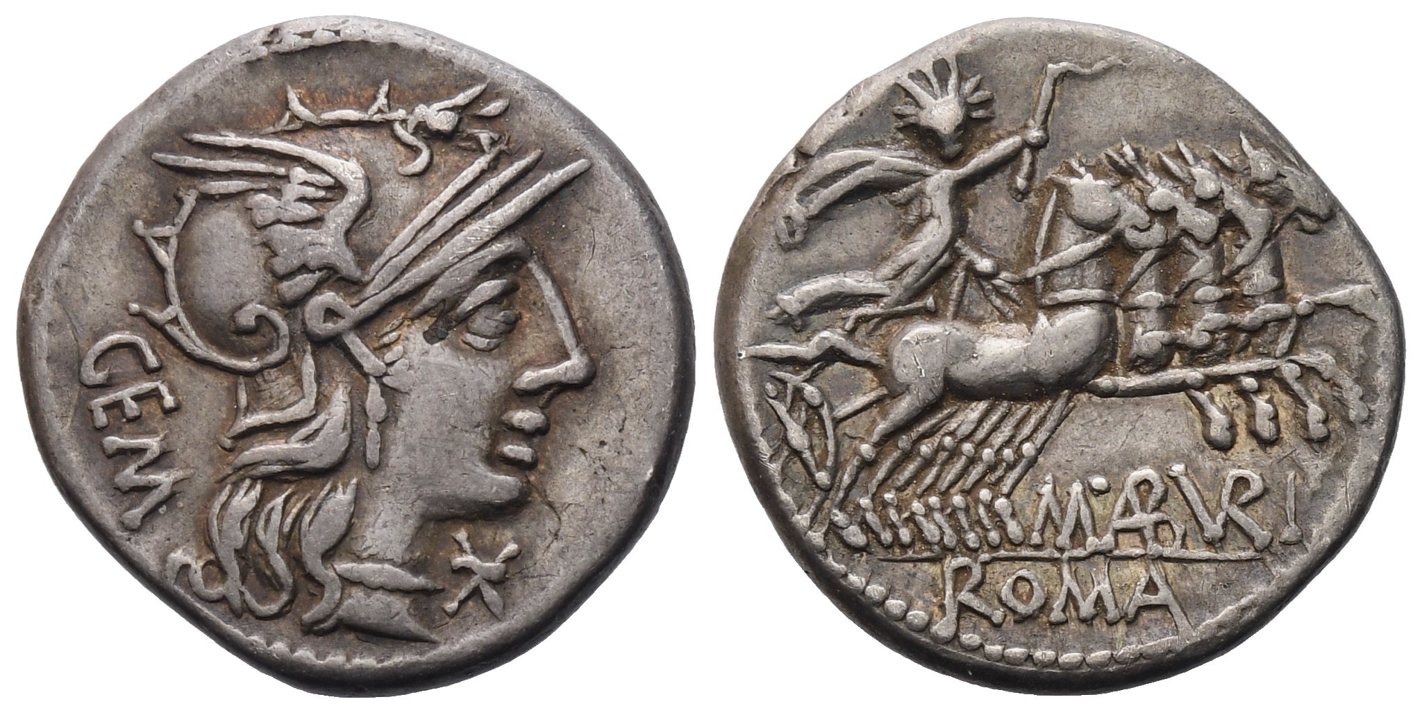 Helmeted head of Roma to r.; GEM behind, mark of value below chin; Rv. Sol driving galloping quadriga to r.; M·ABVRI (partially ligate) below, ROMA in exergue. Crawford 250/1; Babelon (Aburia) 6; Sydenham 487. Good very fine.