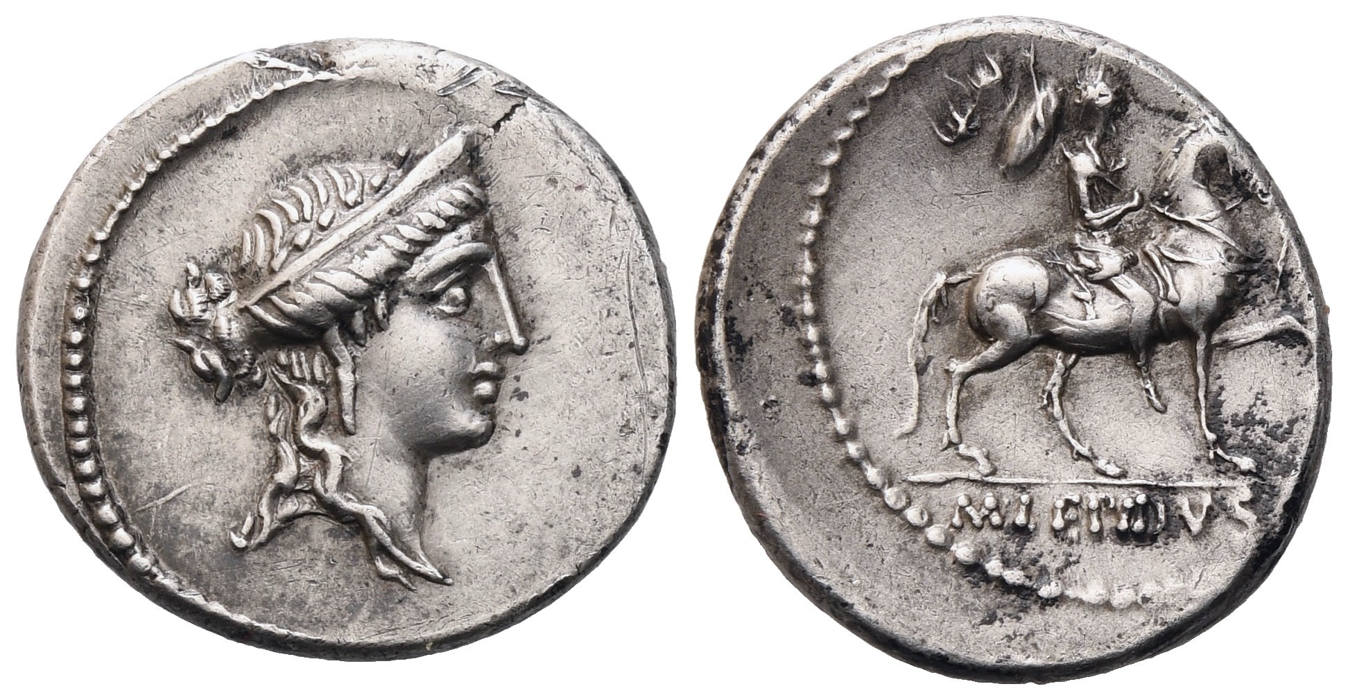 Laureate and diademed female head to r.; Rv. Equestrian statue of M. Aemilius Lepidus holding trophy in his l. hand and reins in his right; in exergue, M·LEPIDVS. Crawford 419/1a; Babelon (Aemilia) 21; Sydenham 827. Reverse slightly off-centre, otherwise good very fine / about extremely fine.