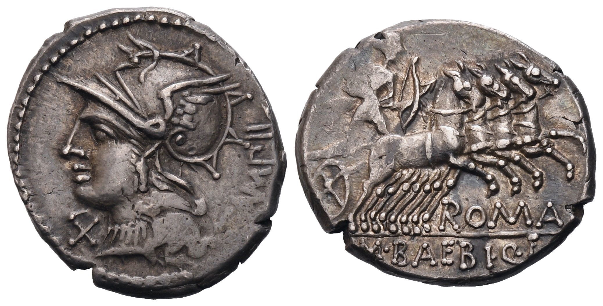 Helmeted head of Roma l., wearing necklace of pendants; behind, TAMPIL upwards; before, X (mark of value); Rv. Apollo in quadriga r., holding reins, bow and arrow in l. hand and branch in r. hand; below, ROMA; in exergue, M·BAEBI·Q·F. Crawford 236/1a; Babelon (Baebia) 12; Sydenham 489. Old cabinet tone. About extremely fine.