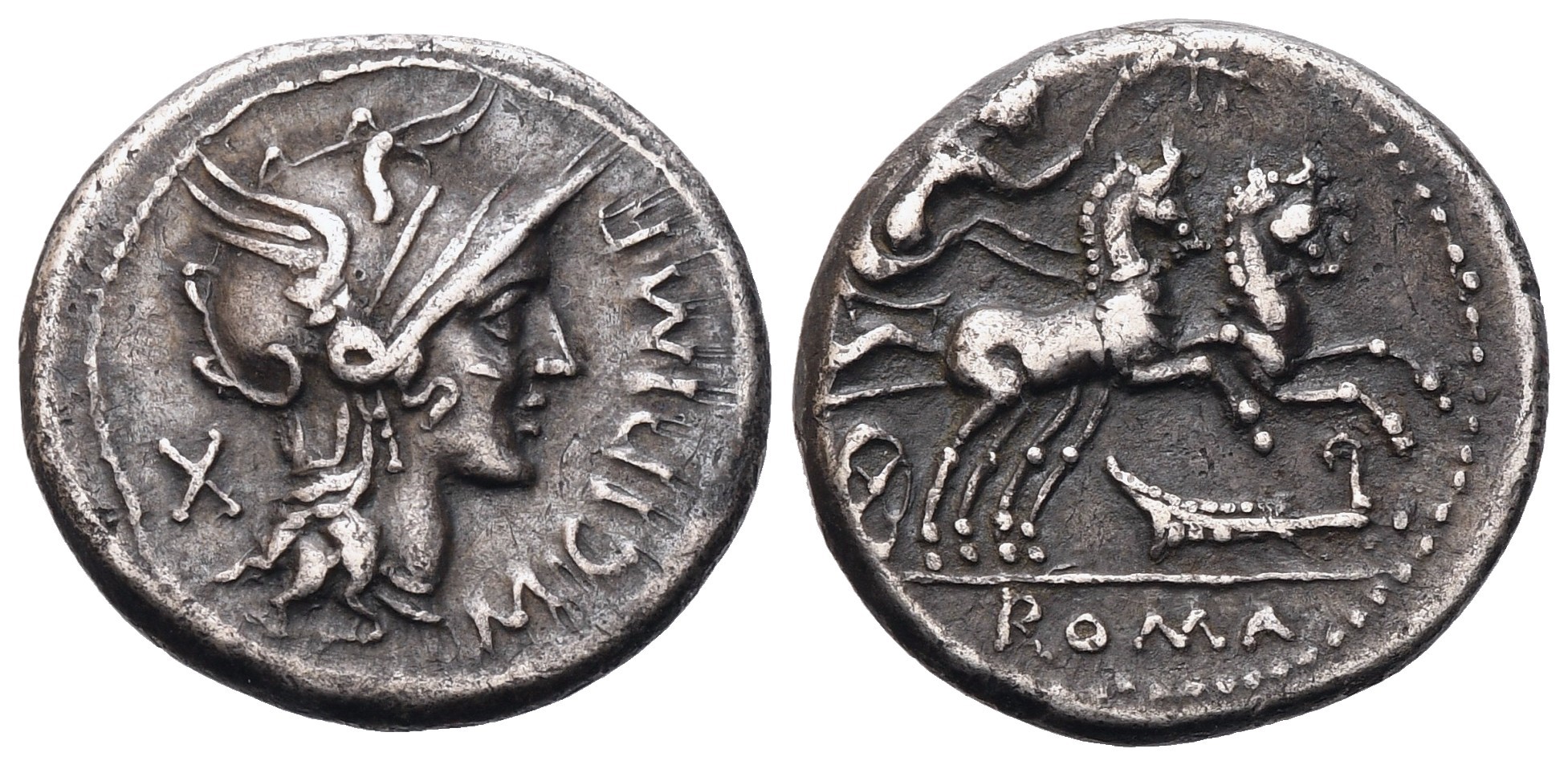 Helmeted head of Roma r.; before, M·CIPI·M·F; behind, X (mark of value); Rv. Victory in biga r., holding reins and palm-branch tied with fillet; below, rudder; in ex. ROMA. Crawford 289/1; Babelon (Cipia) 1; Sydenham 546.Good VF