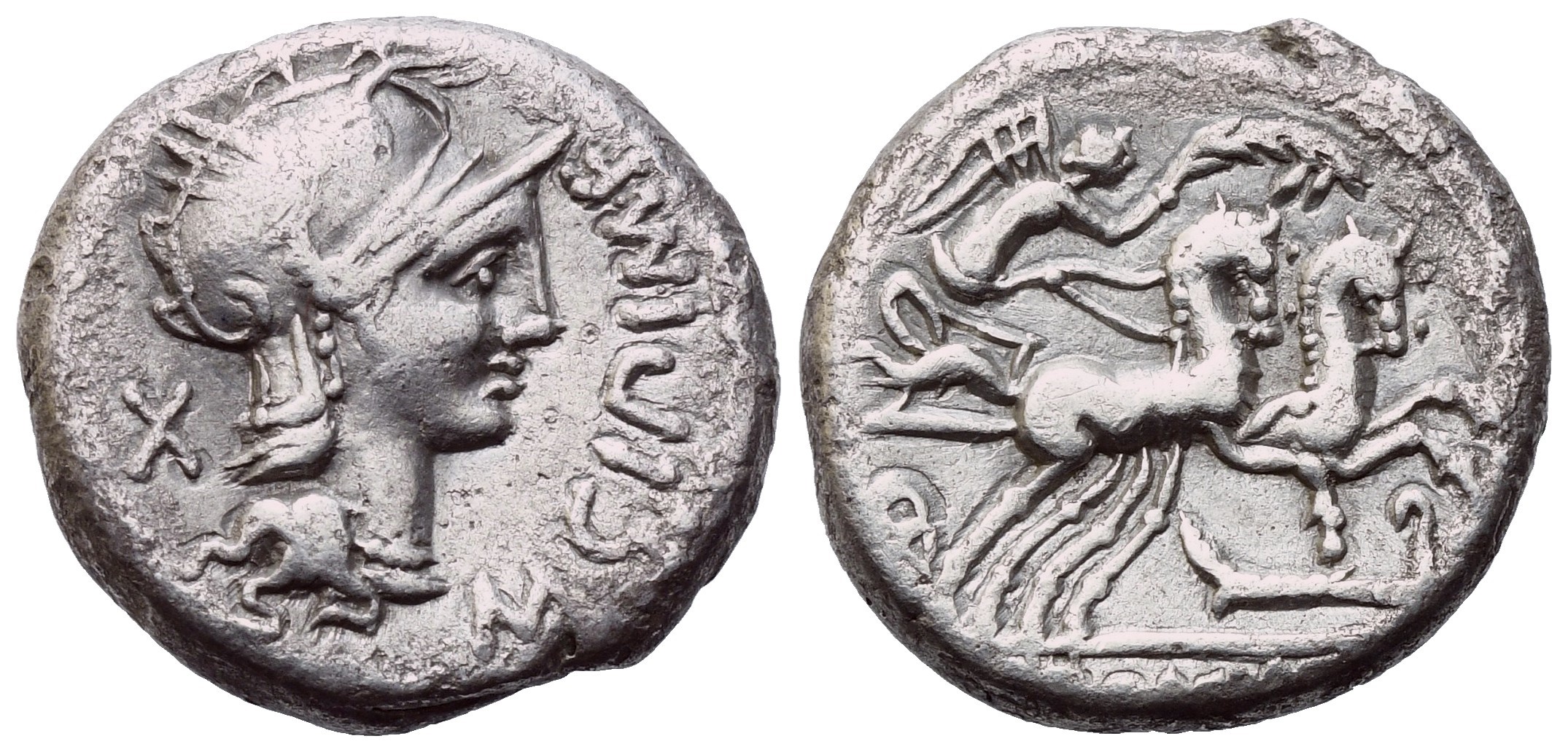 Helmeted bust of Roma r.; M·CIPI·M·F before; X (mark of value) behind; Rv. Victory driving biga r., holding palm branch; rudder below; [ROMA] in exergue. Crawford 289/1; Babelon (Cipia) 1; Sydenham 546. gVF