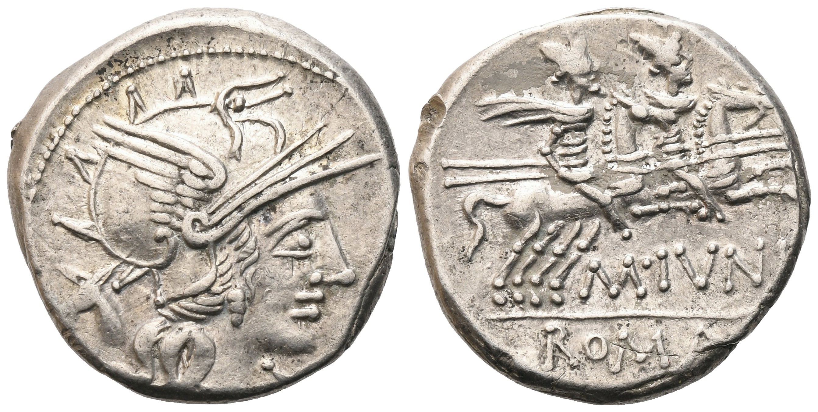 Head of Roma to r., wearing winged helmet; behind, head of a donkey to l.; below chin, [X] (mark of value); Dioscuri riding on horseback to r.; M·IVNI below; ROMA in exergue. Crawford 220/1; Babelon (Junia) 8; Sydenham 408. Good very fine.