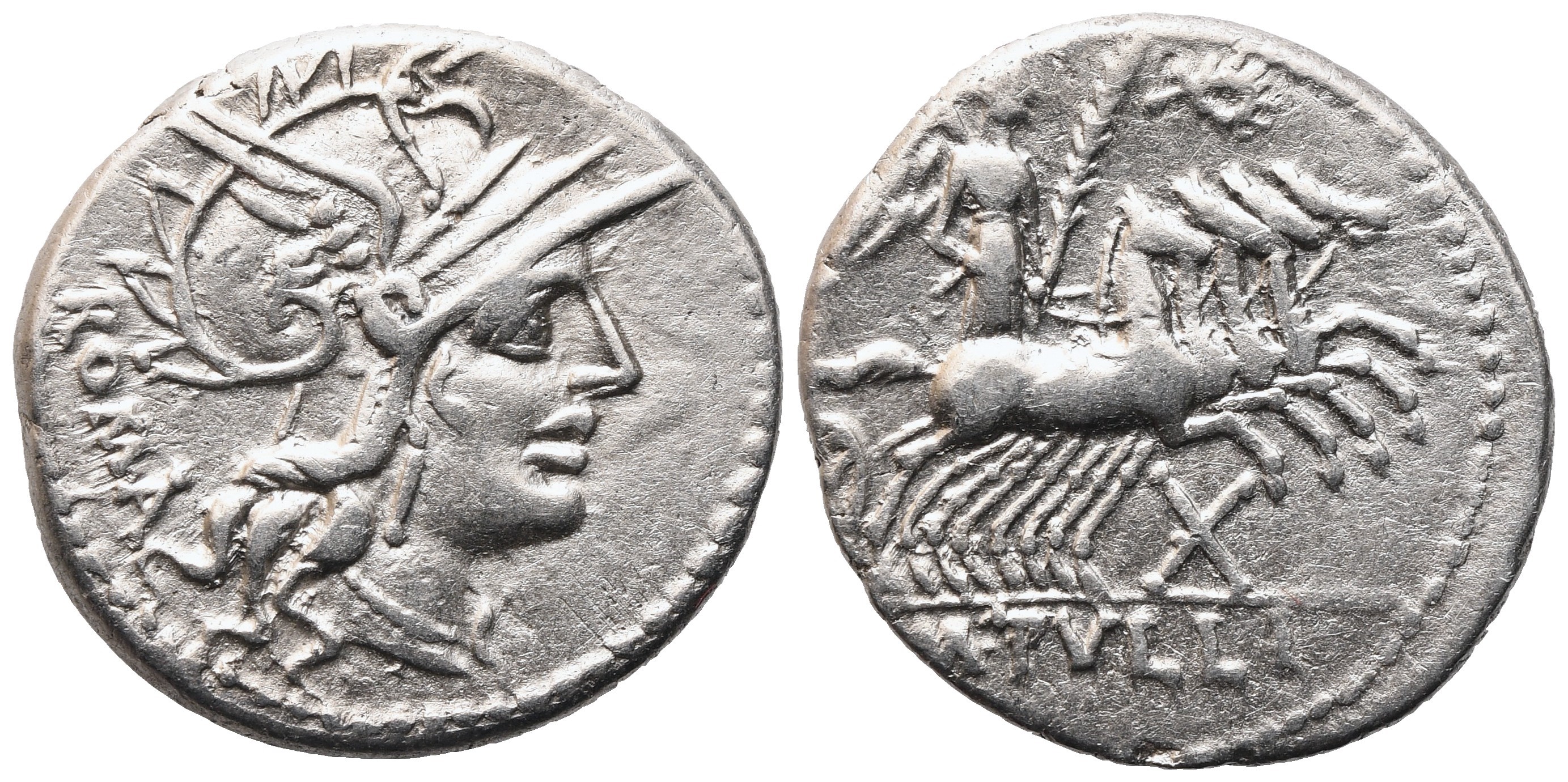 Head of Roma to r., wearing winged helmet; behind, ROMA downwards; Rv. Victory driving quadriga to r., holding palm frond in her left hand and reins in her right; above, wreath; below horses, X (mark of value); in exergue, M·TVLLI. Crawford 280/1; Babelon (Tullia) 1; Sydenham 531. Near extremely fine.