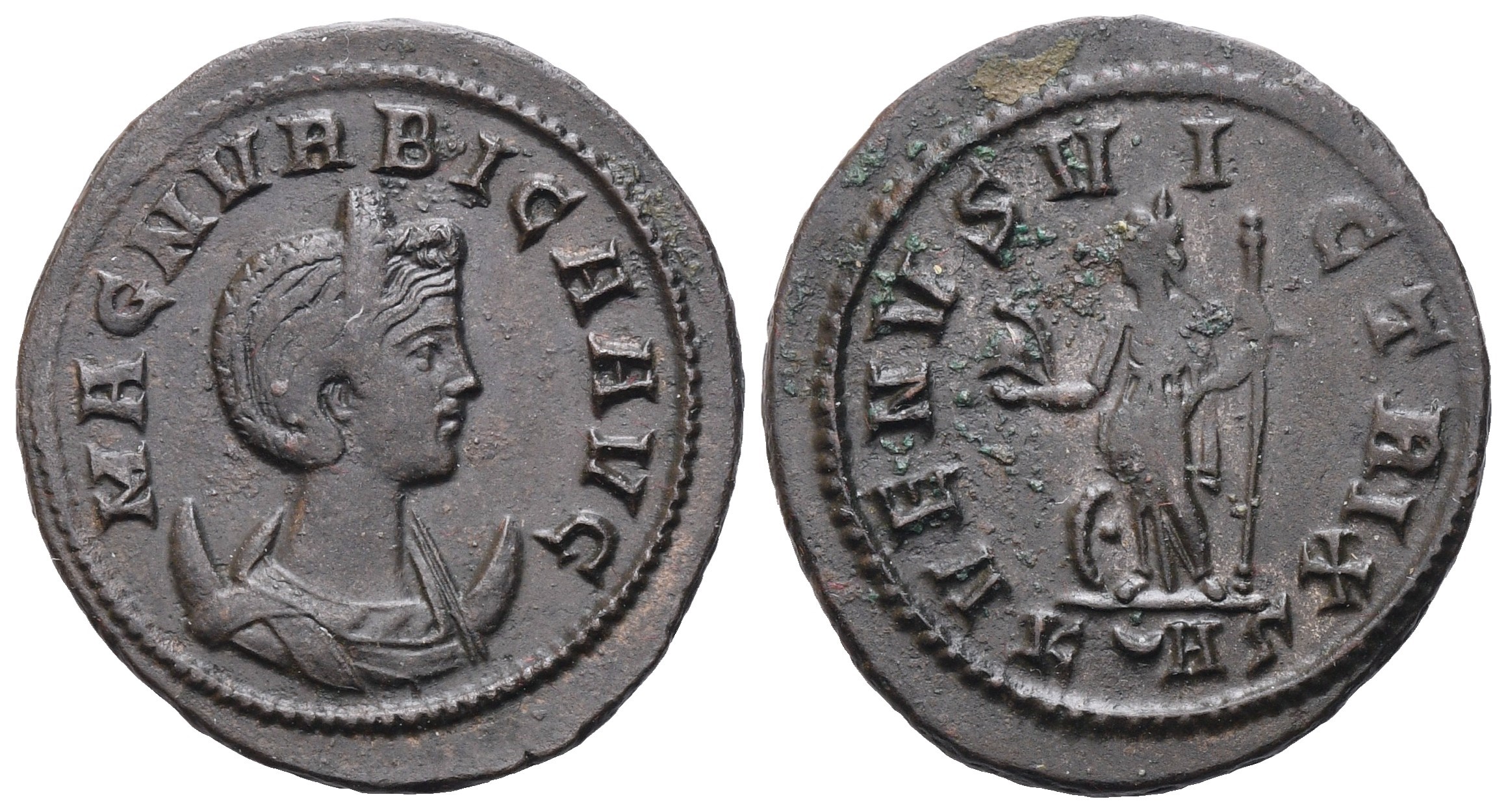 6th officina. 5th emission of Carinus, mid November AD 284. MAGN VRBICA AVG Draped bust r., wearing stephane and set upon crescent; Rv. VENVS VICTRIX / K (crescent) A Ο. Venus standing l., holding helmet and sceptre; shield to l. RIC 343 (Carus). Good very fine.
