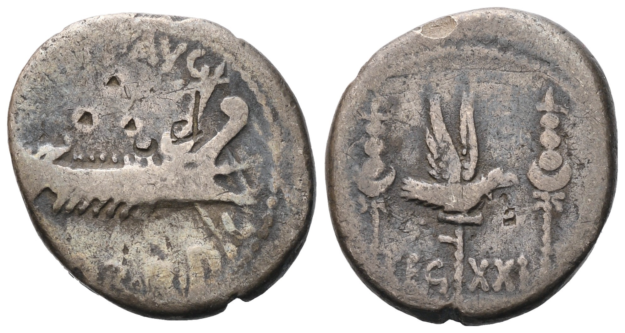 Military mint moving with M. Antonius. Ship r., with sceptre tied with fillet on prow; above, [ANT·]AVG; below, [III·VIR·R·]P·C; Rv. Aquila between two standards; LEG XXI across lower field. Crawford 544/37; Babelon (Antonia) 136; Sydenham 1244; Sear Imperators 381. aVF