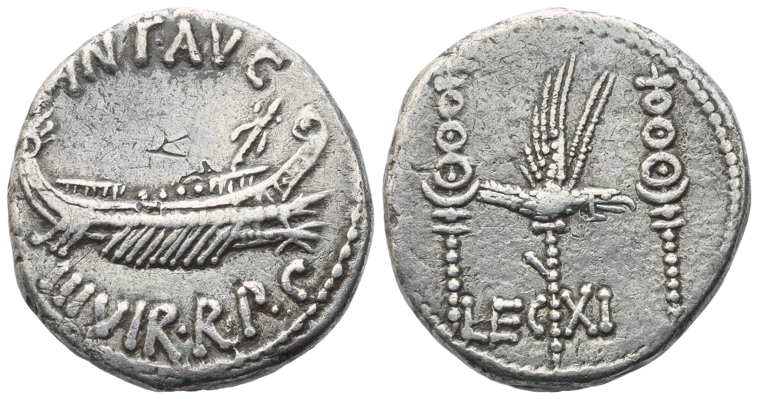 Military mint moving with Mark Antony. Praetorian galley moving to r.; above, ANT·AVG; below, III·VIR·R·P·C; Rv. Legionary eagle between two standards; LEG XI across lower field. Crawford 544/25; Babelon (Antonia) 118; Sydenham 1229. Good very fine.