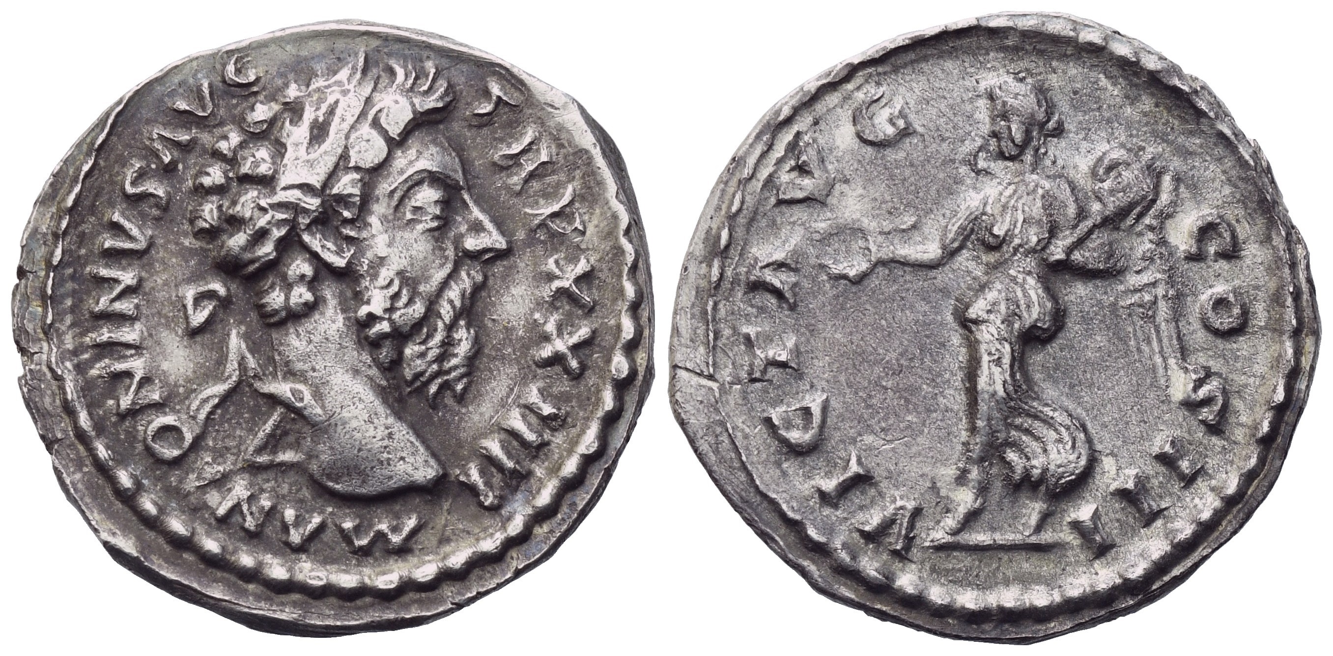 M ANTONINVS AVG-TR P XXIIII Laureate head of Marcus Aurelius r.; Rv. VICT AVG-COS III Victory advancing l., wreath raised in r. hand, trophy over l. shoulder. RIC III 225. gVF
