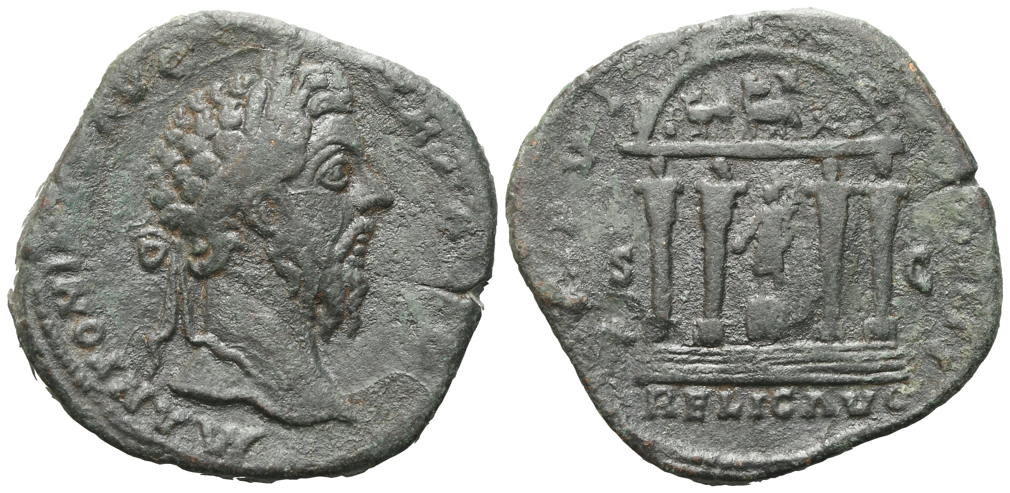 M ANTONINVS AVG TR P XXVII Laureate bust r.; Rv. IMP VI COS III / S - C / RELIG AVG Aedes Mercurii: Mercury standing l. on pedestal, holding caduceus and purse, within temple with four herm columns; on tympanum, tortoise, cock, ram, petasus, winged caduceus, and purse. BMC 1441. Cohen 535. RIC 1076. Very fine.