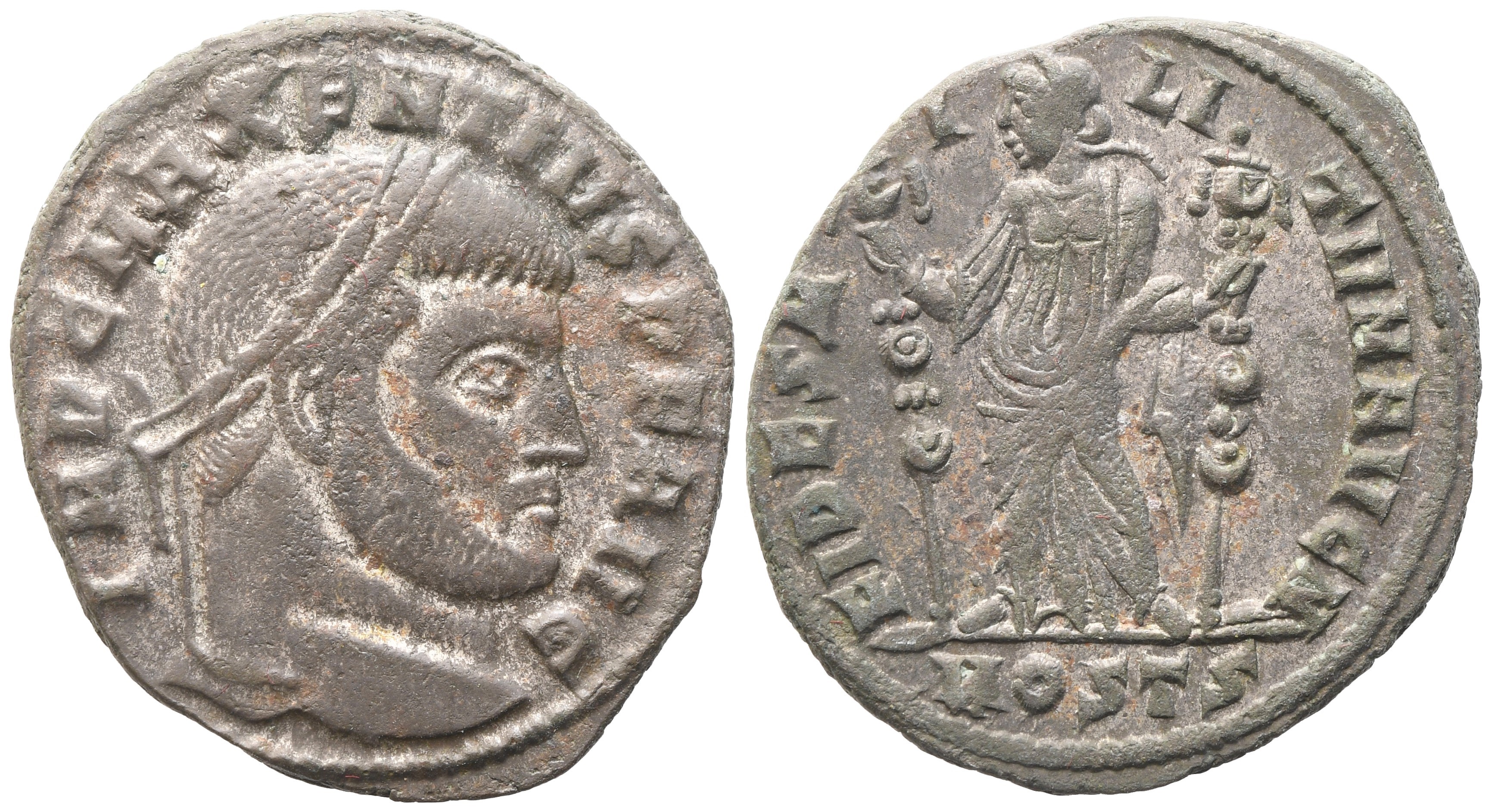 IMP C MAXENTIVS P F AVG Laureate head to r.; Rv. FIDES MILITVM AVG N Fides standing to l. with standard in each hand; in exergue, MOST S. RIC 45. Good very fine.