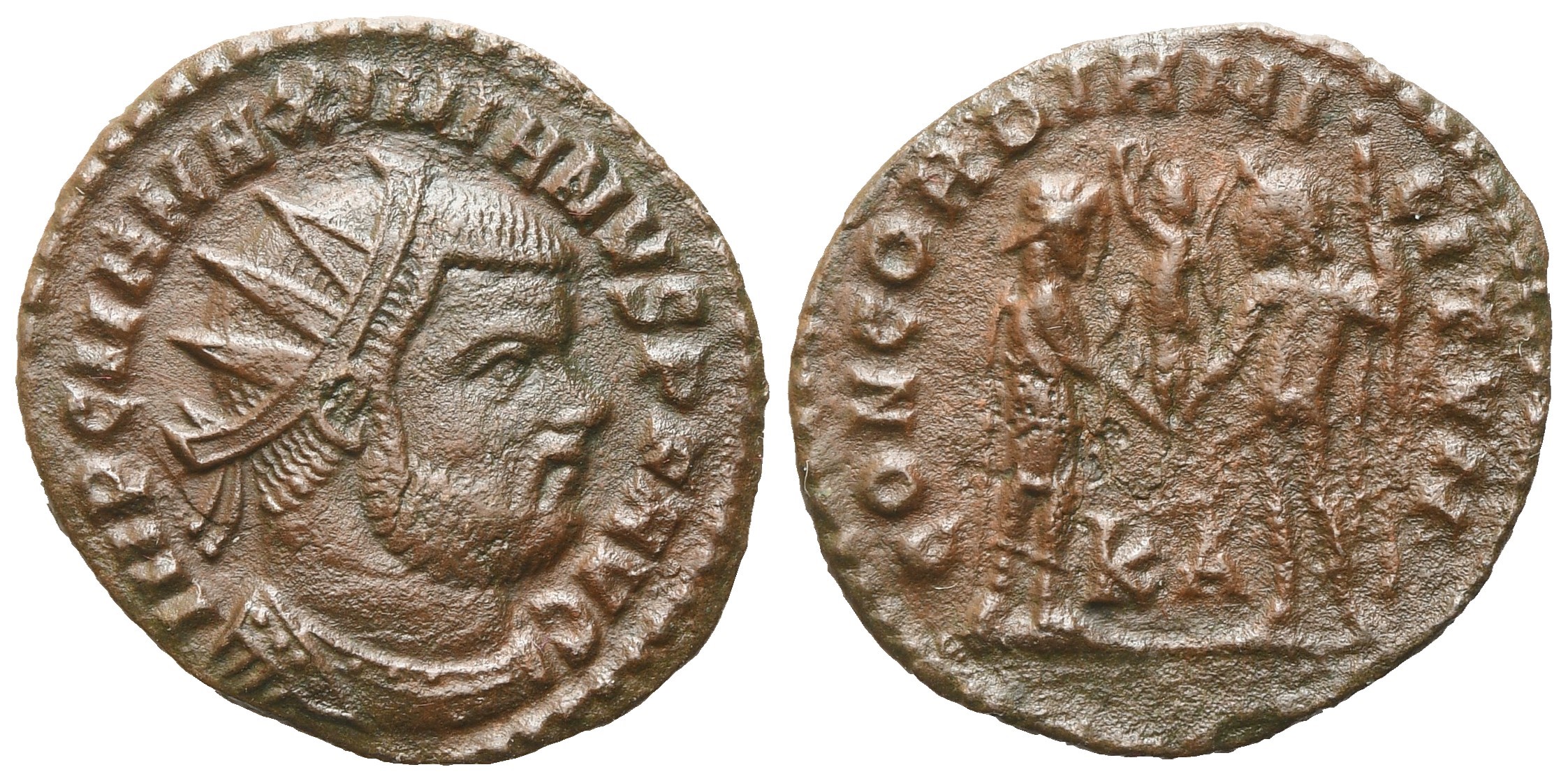 IMP C MA MAXIMIANVS PF AVG Radiate cuirassed bust r.; Rv. CONCORDIA MILITVM Emperor standing r., receiving Victory on globe from Jupiter, standing l., holding sceptre. In field, KA. RIC 16B. Brown patina. Good very fine.