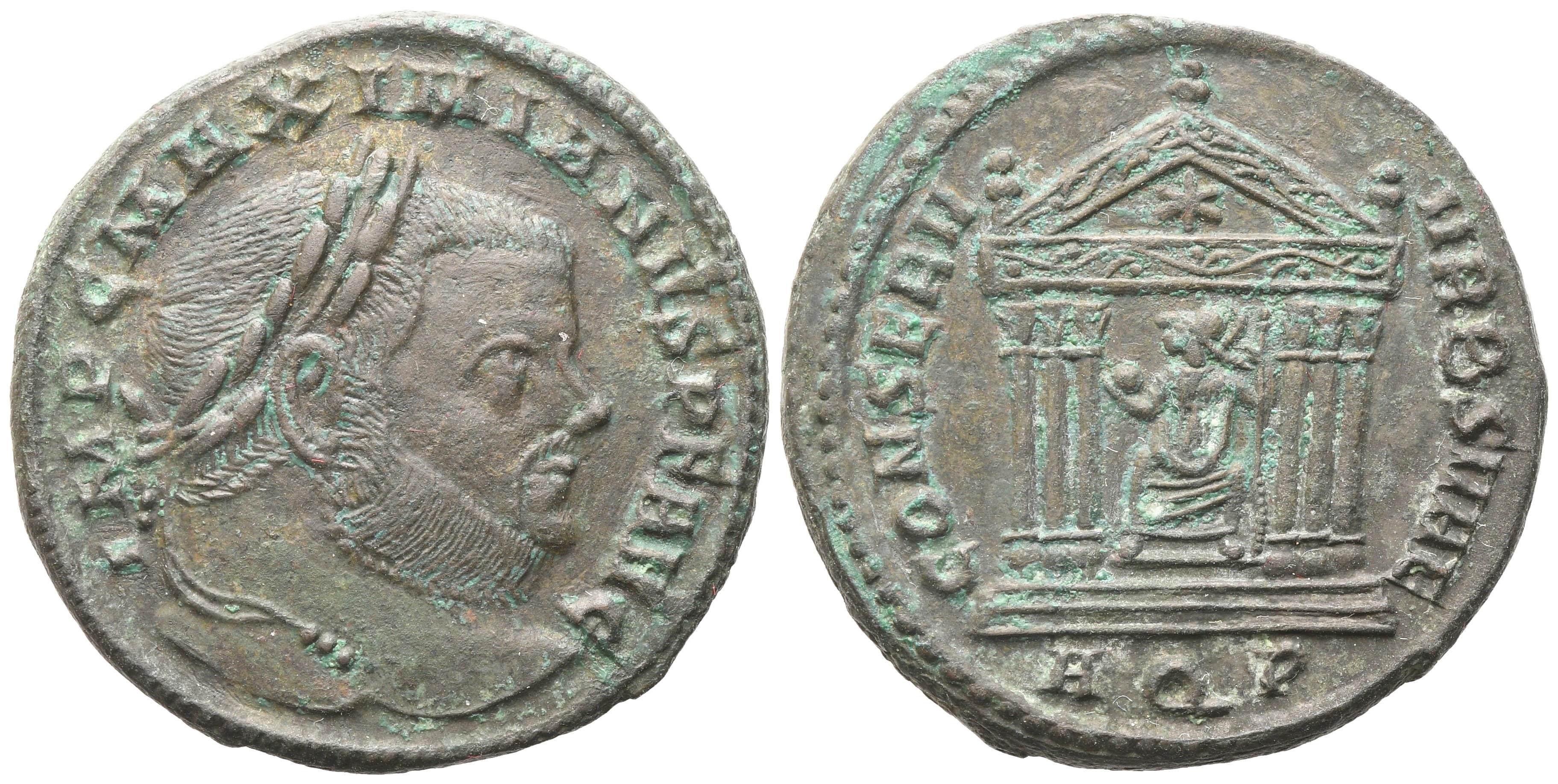IMP C MAXIMIANVS P F AVG Laureate head r.; Rv. CONSERV VRB SVAE Roma seated facing, head to l., holding globe and sceptre with shield by side, in hexastyle temple; AQP in exergue. RIC VI 118. gVF