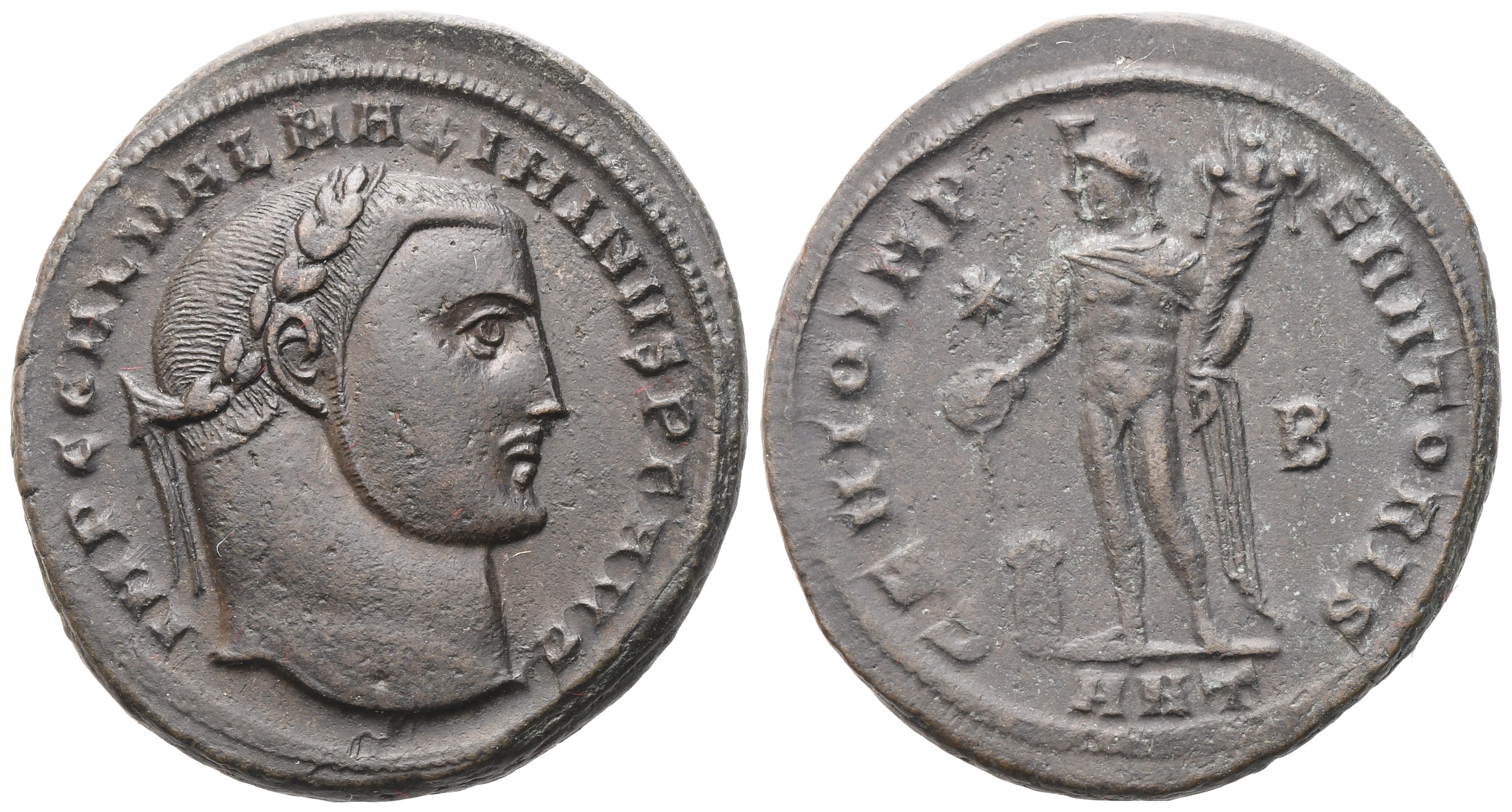 IMP C GAL VAL MAXIMINVS P F AVG Laureate head of Maximinus II to r.; Rv. GENIO IMPERATORIS / */ B Genius, nude but for chlamys, standing front, head to leftl. holding patera from which liquor flows over lighted altar in his r. hand and cornucopiae in his l.; in exergue, ANT. RIC 133c. Deep dark brown patina. aEF / gVF